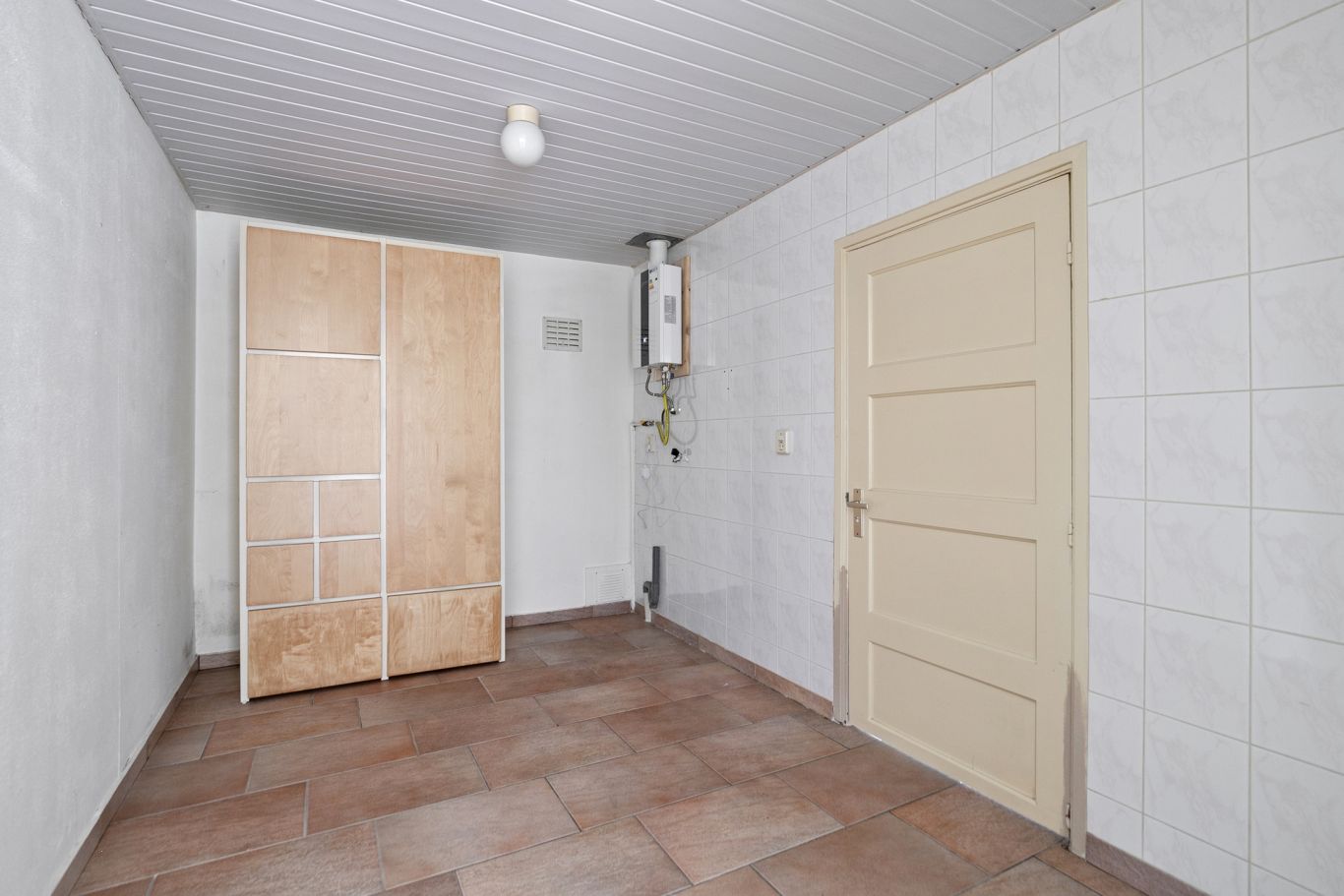 De woonkeuken is geplaatst in een rechte wandopstelling en voorzien van diverse inbouwapparatuur. Hier is tevens voldoende ruimte om een eettafel te plaatsen. Vanuit de keuken is de praktische bijkeuken te bereiken. In deze ruimte is een eenvoudig keukenblok geplaatst en via een vaste trap is de eerste verdieping te bereiken. Tevens is vanuit hier toegang tot een vaste kast, welke ideaal geschikt is als proviandruimte.
