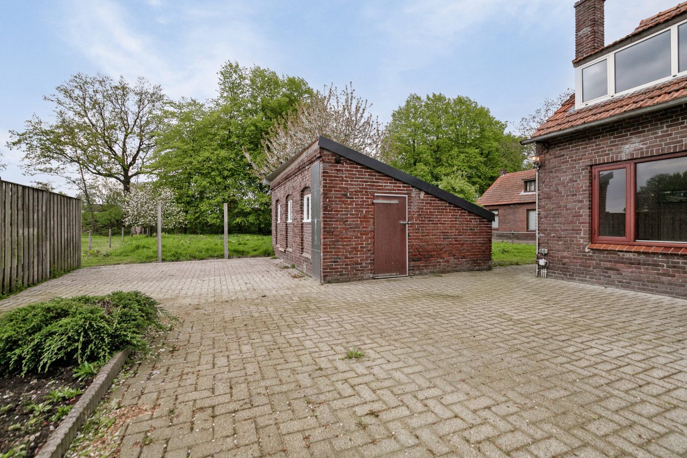 Achter de woning bevindt zich de ruime siertuin met fruitbomen en sierbomen en landbouwgronden. Hier heeft u een vrij uitzicht over de landerijen. Daarnaast is het perceel voorzien van gebroken asfalt, betonplaten, grind, tegels en betonklinkers.