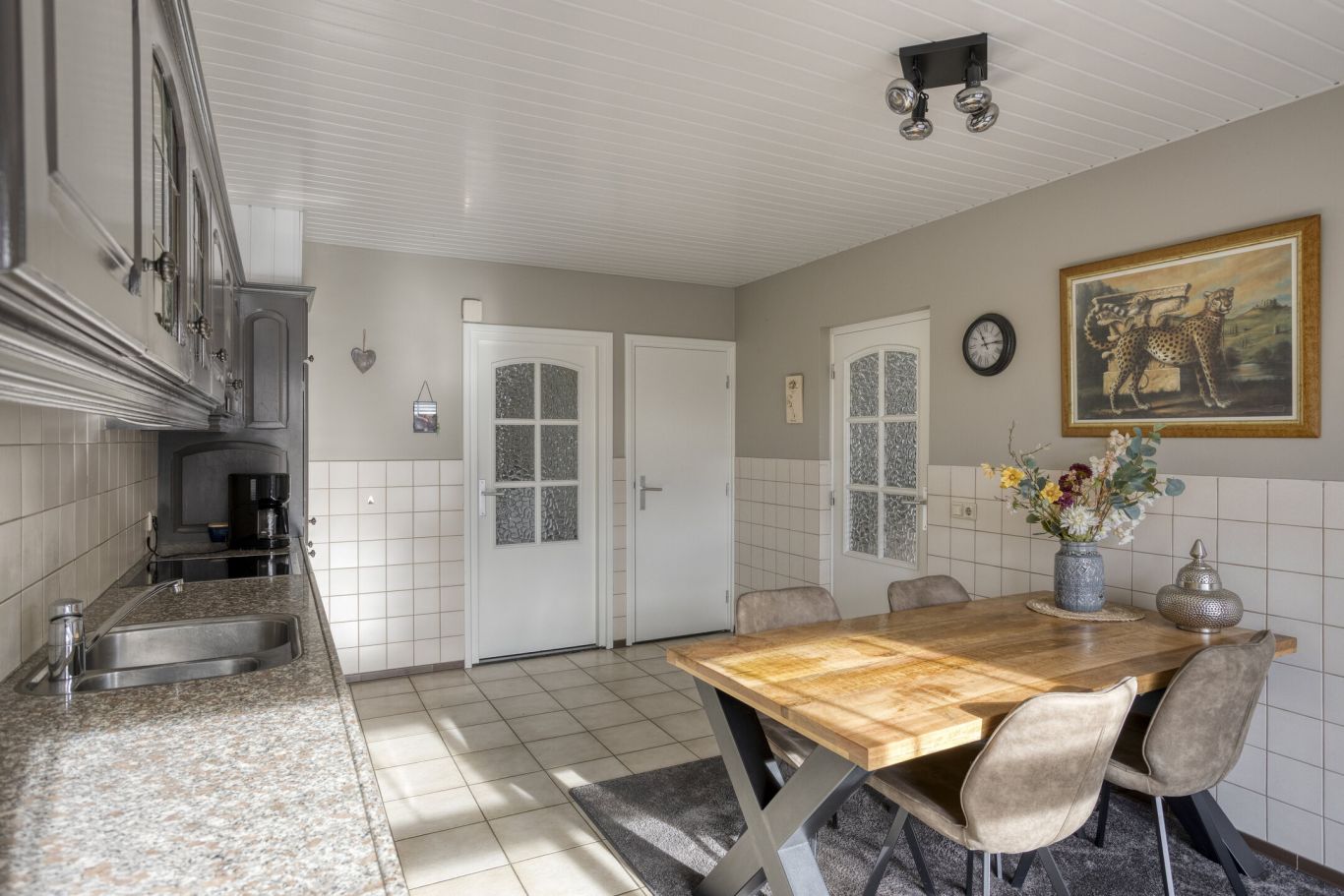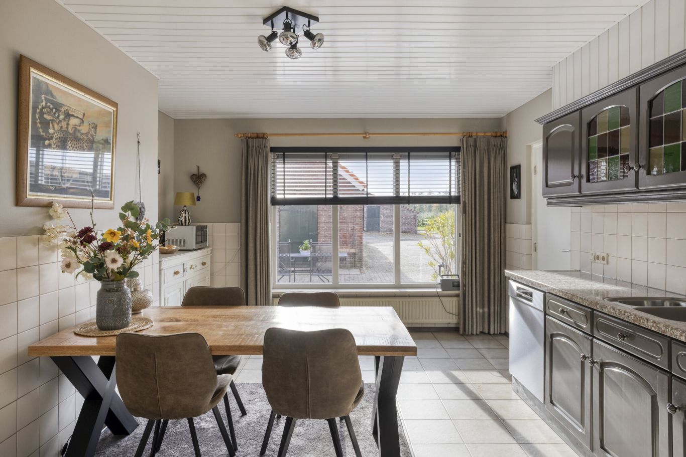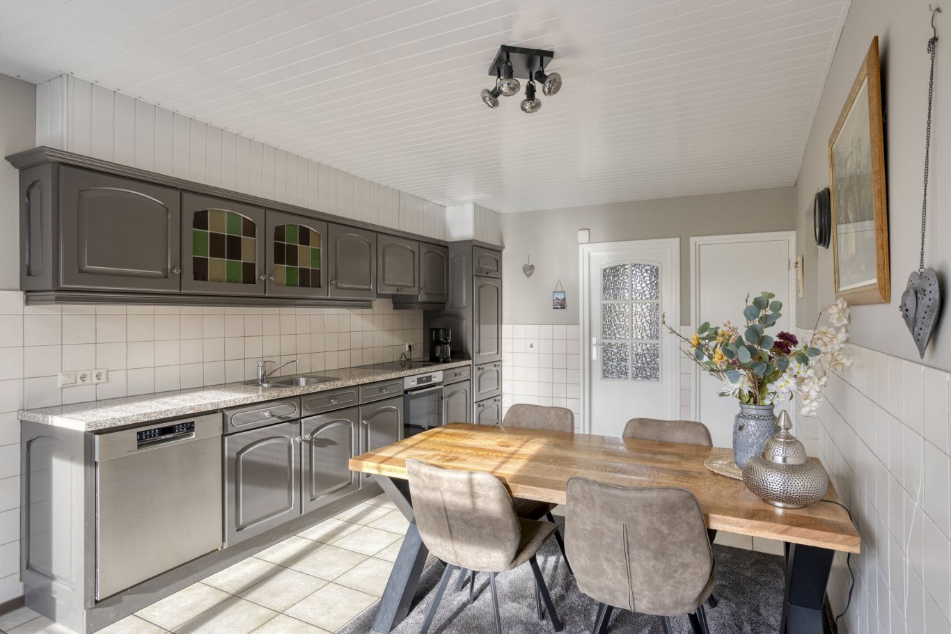 Aansluitend aan de eethoek ligt de keuken, geplaatst in wandopstelling en uitgerust met diverse inbouwapparaten. Het