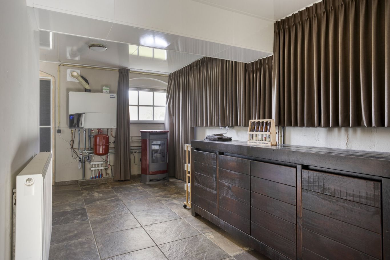 Verwarming vindt plaats via een cv-installatie en twee pelletkachels (2025). Daarnaast is in de keuken en badkamer