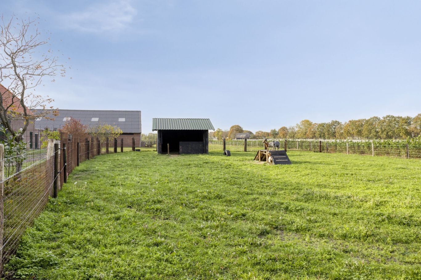 Grenzend aan het erf liggen diverse weiden, die zijn omheind met schapengaas op houten palen. Bij de weide waar het