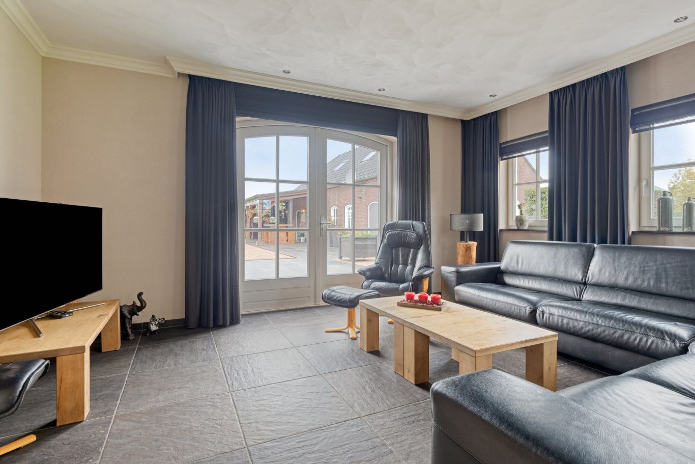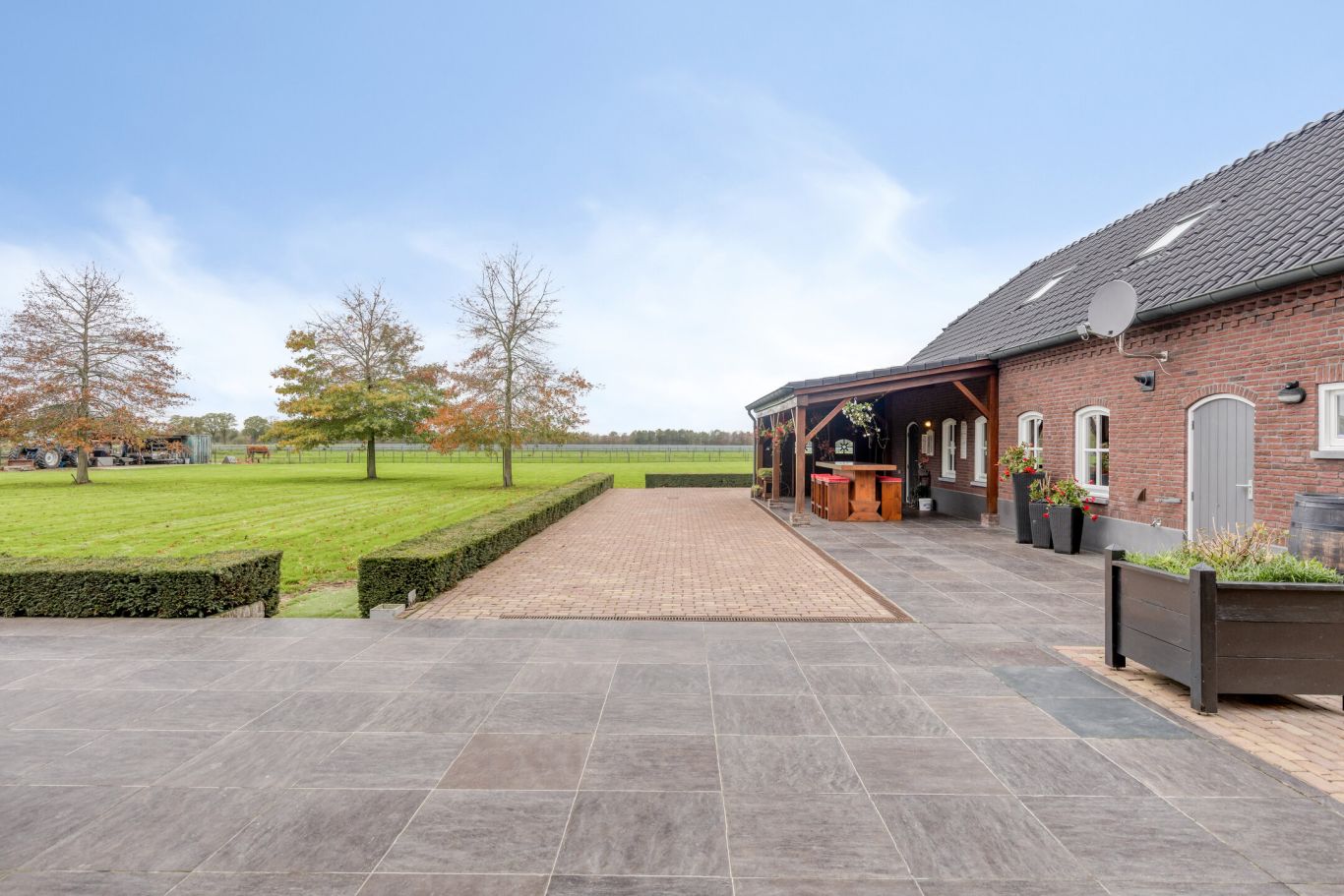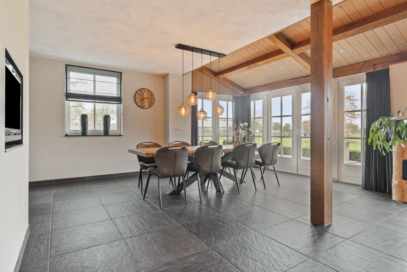 Vanuit de woonkamer en de woonkeuken loopt u zo naar het terras aan de woning. Naast het terras is de tuin voorzien van een haag en een groot gazon met een fraai uitzicht over de achterliggende landerijen.