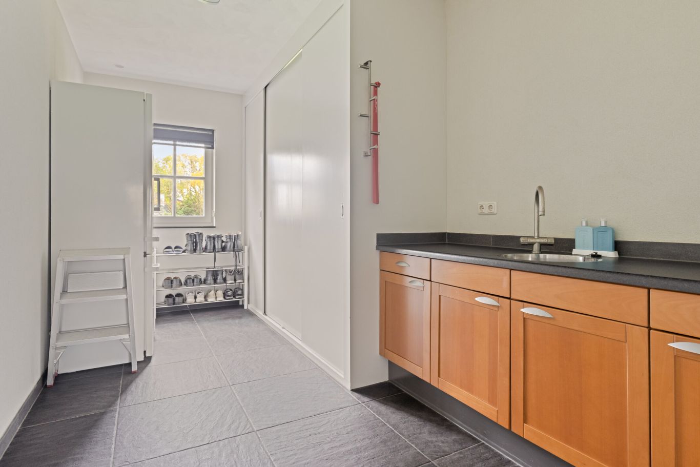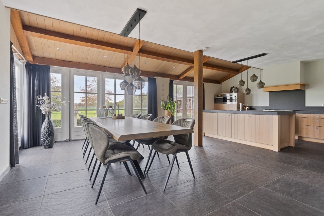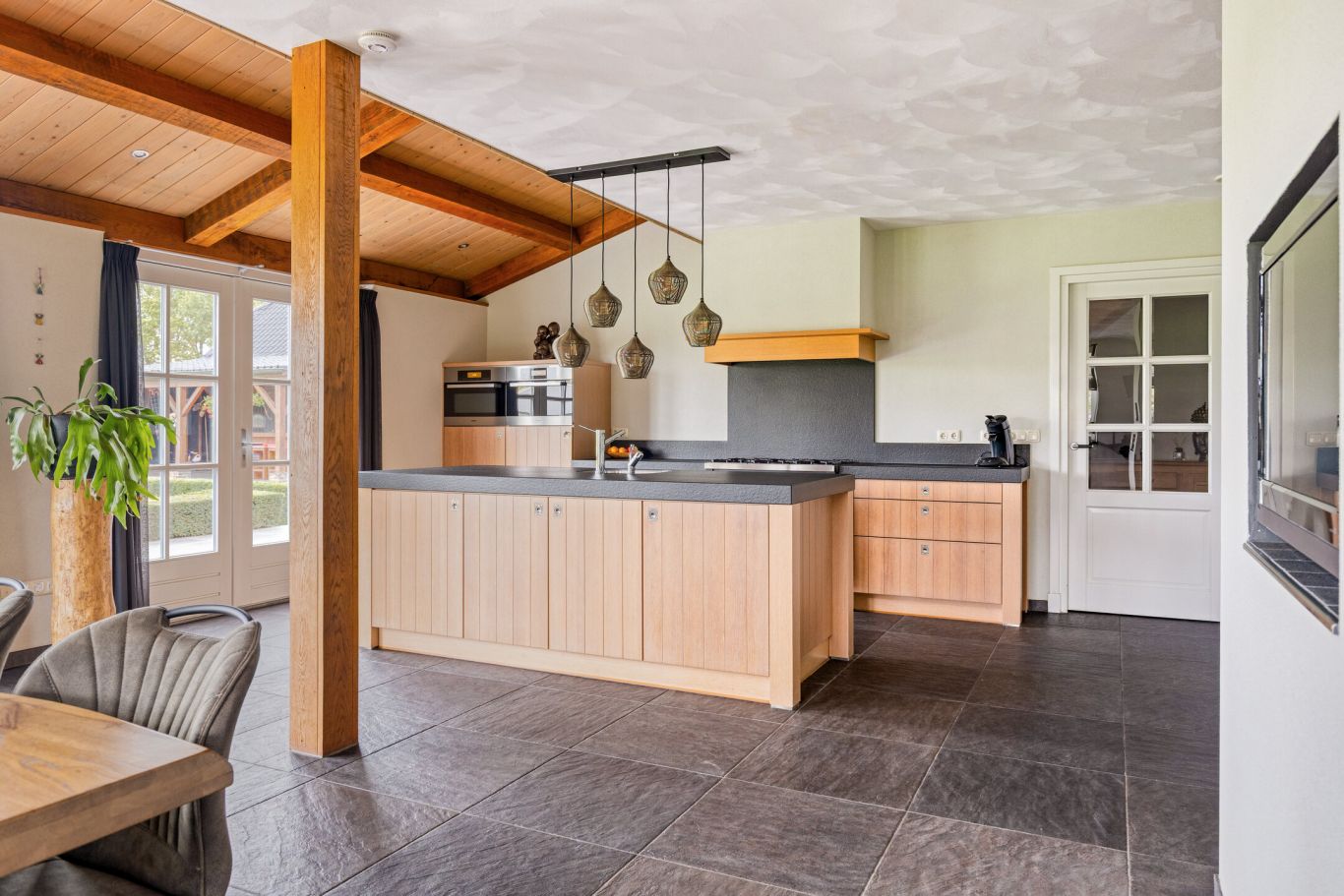 Aan de voorzijde van de woning aan de linkerzijde bevindt zich de ruime woonkeuken. De eiken houten keuken is geplaatst in een rechte wandopstelling en een spoeleiland. De inbouwapparatuur bestaat uit onder andere een Quooker en waterontharder in het spoeleiland. Daarnaast ook uit een Borreti gasfornuis met bakoven en zes pitten, een afzuigkap, een combi-magnetron, een stoomoven, een koelkast en een vaatwasser. Deze keuken is echt van alle gemakken voorzien, waardoor u heerlijke maaltijden kunt bereiden. De ruimte is ruim genoeg om en grote eettafel te plaatsen en hier heerlijk te tafelen met uw familie of vrienden. Via de diverse dubbele openslaande tuindeuren heeft u toegang tot de fraaie en groene achtertuin. Tevens is via een trap de praktische kelder te bereiken.