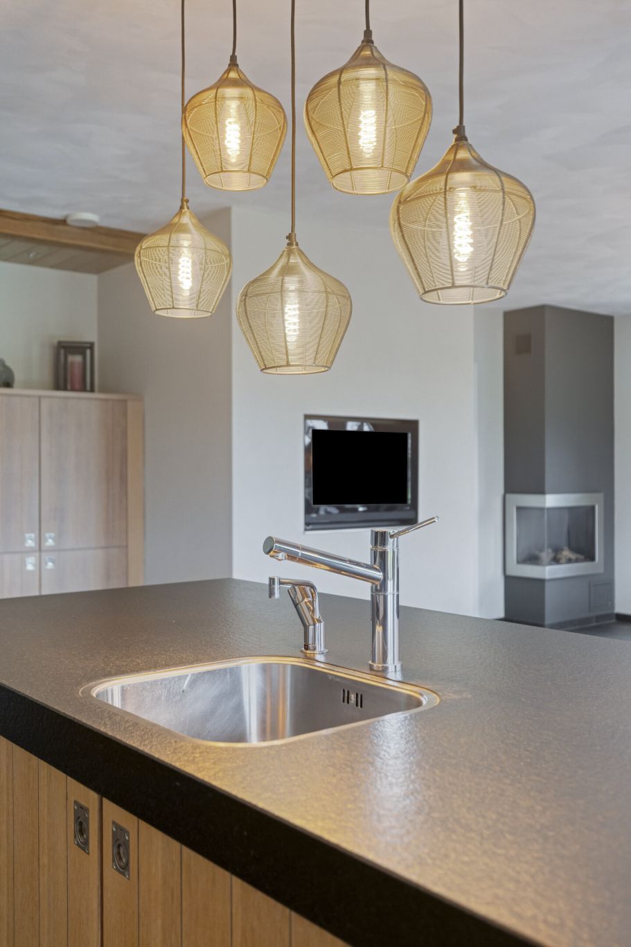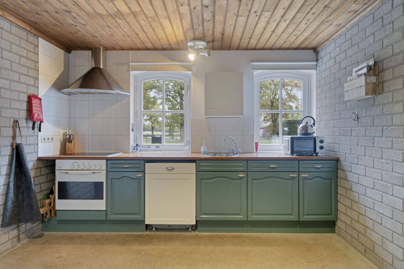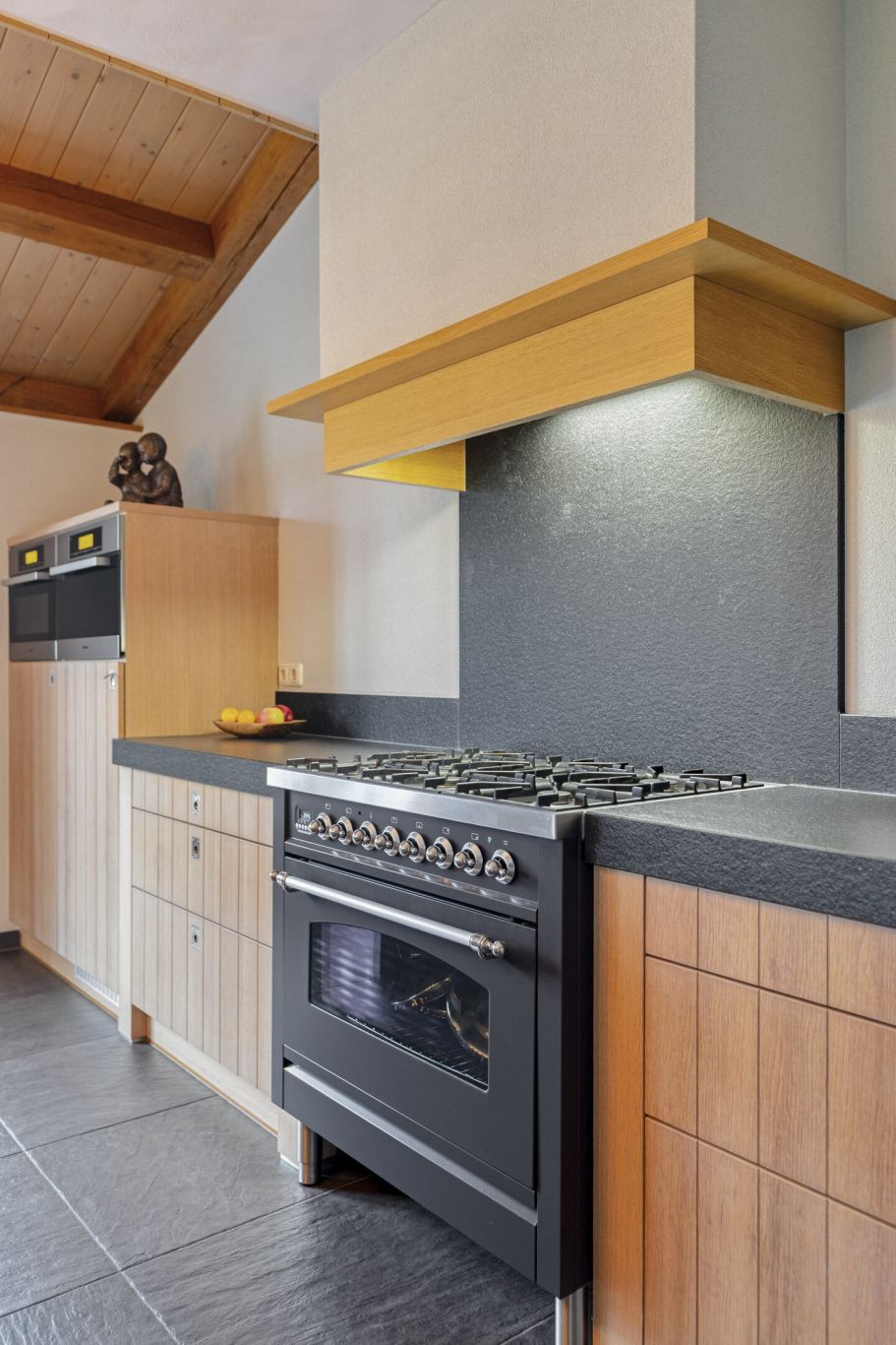 Aan de voorzijde van de woning aan de linkerzijde bevindt zich de ruime woonkeuken. De eiken houten keuken is geplaatst in een rechte wandopstelling en een spoeleiland. De inbouwapparatuur bestaat uit onder andere een Quooker en waterontharder in het spoeleiland. Daarnaast ook uit een Borreti gasfornuis met bakoven en zes pitten, een afzuigkap, een combi-magnetron, een stoomoven, een koelkast en een vaatwasser. Deze keuken is echt van alle gemakken voorzien, waardoor u heerlijke maaltijden kunt bereiden. De ruimte is ruim genoeg om en grote eettafel te plaatsen en hier heerlijk te tafelen met uw familie of vrienden. Via de diverse dubbele openslaande tuindeuren heeft u toegang tot de fraaie en groene achtertuin. Tevens is via een trap de praktische kelder te bereiken.