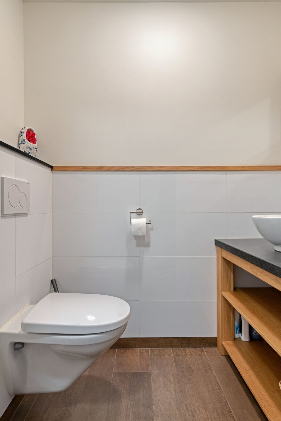 De badkamer is compleet ingericht met een uitnodigend vrijstaand bad in het midden van de badkamer. Daarnaast treft u hier nog een inloopdouche en een wastafel aan. Via een raam verkrijgt u natuurlijke lichtinval en natuurlijke ventilatie naast de mechanische ventilatie.