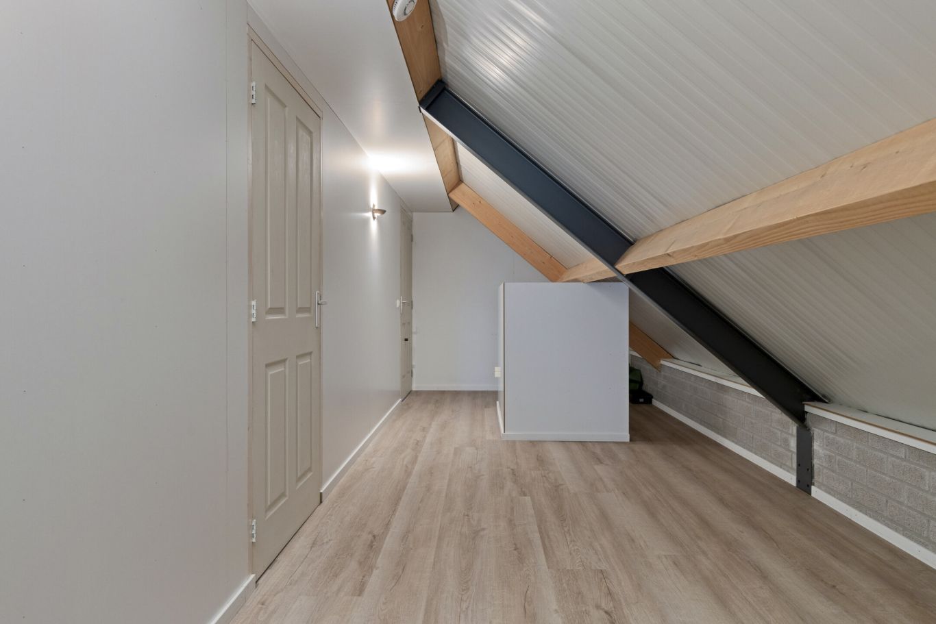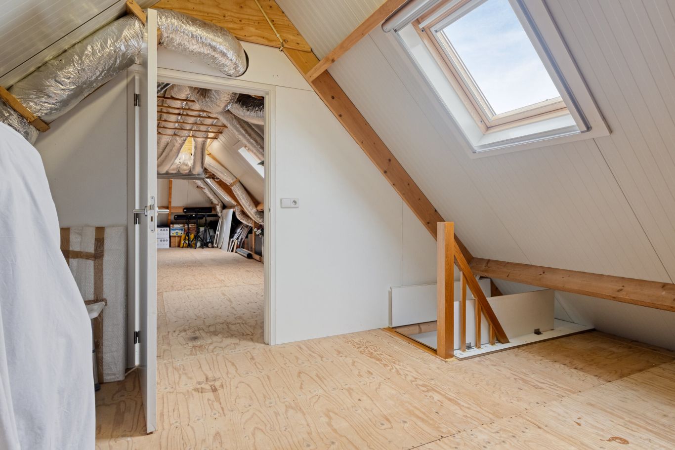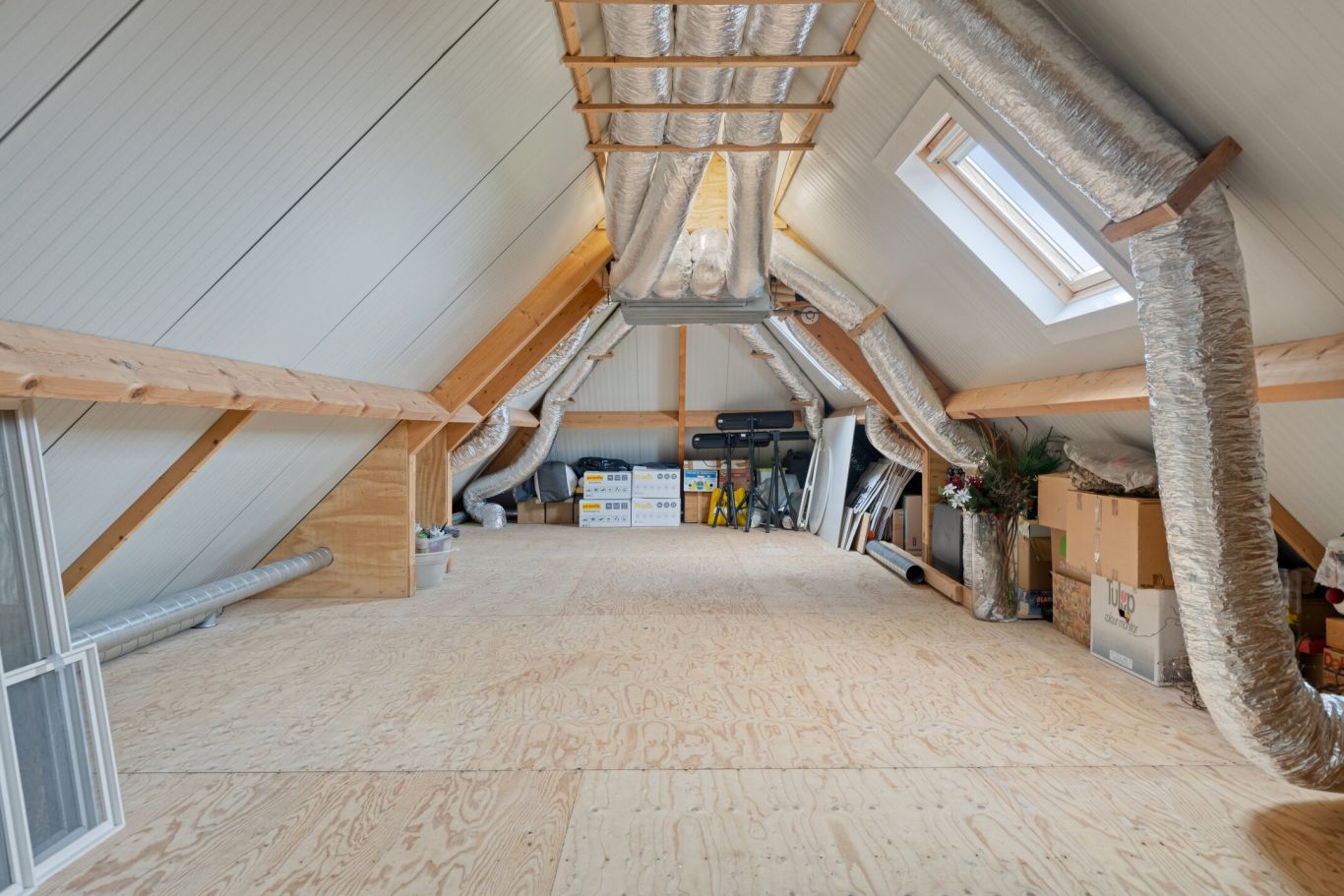 Via een vaste trap is de tweede verdieping te bereiken. Vanuit de overloop met dakraam is de open zolderruimte te bereiken. Deze open ruimte is momenteel in gebruik als opslagruimte, maar zou ook gebruikt kunnen worden als hobbyzolder, sportruimte of bijvoorbeeld extra werkplek. Twee dakramen zorgen hier voor de natuurlijke lichtinval.