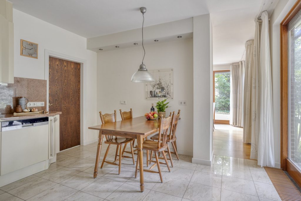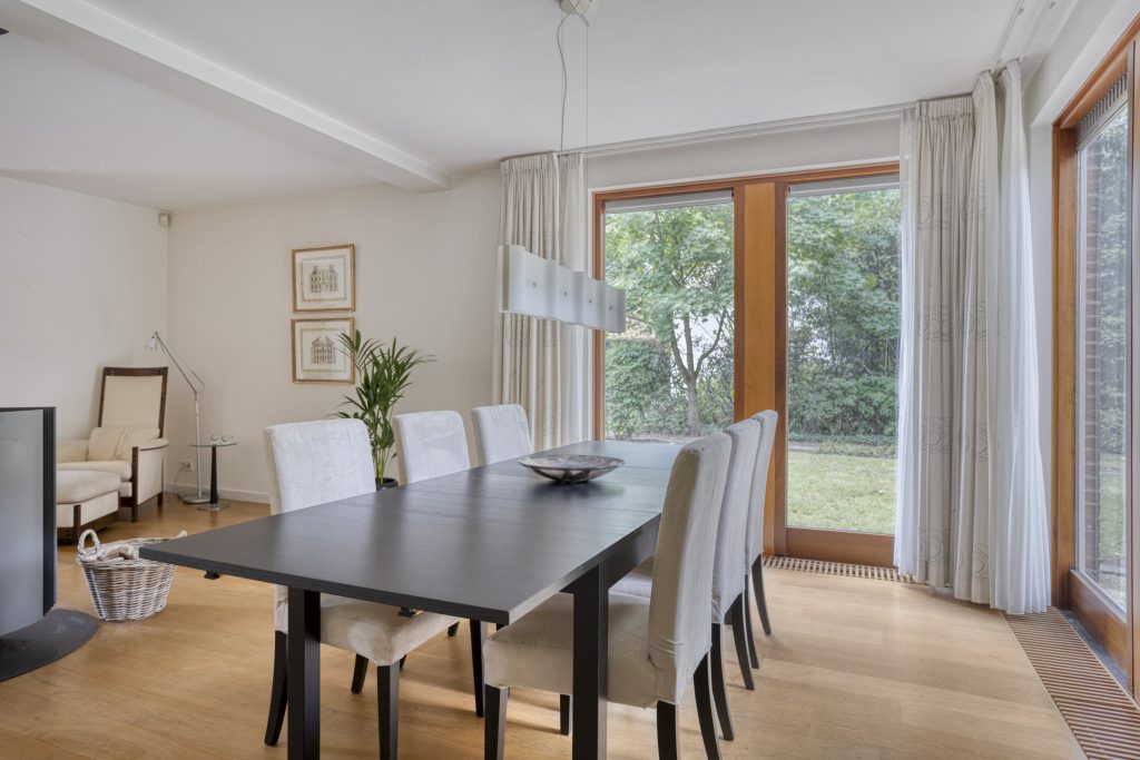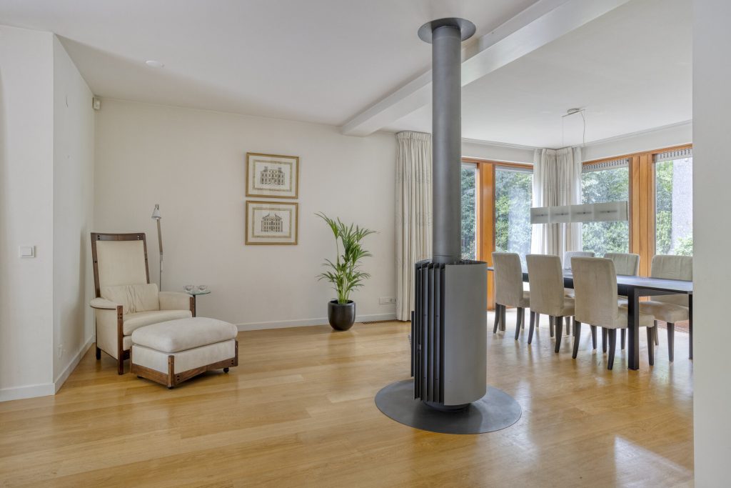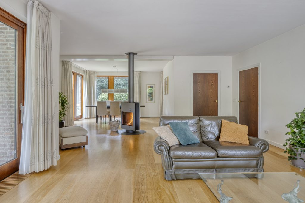 De woonkamer heeft een mooie parketvloer en biedt volop ruimte voor een gezellig zit- en eetgedeelte. Een staande 360 graden draaibare houthaard in het midden van de kamer zorgt voor extra sfeer en warmte tijdens de koude wintermaanden. Dankzij de grote raampartijen en twee schuifpuien is er veel natuurlijk licht en heeft u toegang tot een overdekt terras en de groene tuin rondom het huis.