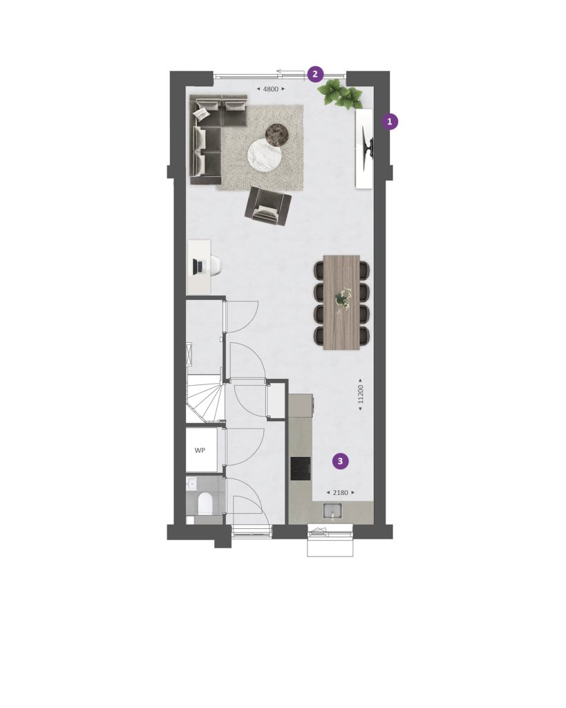 De indeling is bijzonder praktisch met beneden een hal met toilet en technische ruimte, een lichte tuingerichte woonkamer en een open keuken met zicht op de straat. TIP: Maak de woonkamer nóg groter met de optie om deze met 1.20m of 2.40m uit te breiden. De optie voor openslaande tuindeuren zorgen voor veel contact met de achtertuin. Op de verdieping vind je drie slaapkamers en een complete badkamer met douche, wastafel en 2e toilet. Wil je een ligbad? Dat kan! Vergroot de badkamer voor meer ruimte. Je kunt bijvoorbeeld ook de 2 slaapkamers aan de achterzijde samenvoegen tot één grote hoofdslaapkamer.