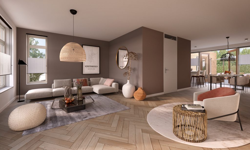 • Vanuit de entree stap je de riante woonkamer met aangrenzende leefkeuken in.