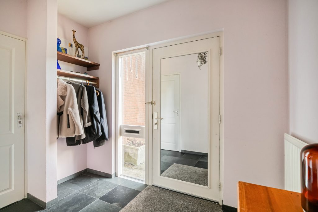 Via de ruime dubbele oprit en de voortuin is de woning bereikbaar. In de ruime hal bevinden zich de meterkast, de toiletruimte en is er toegang tot de inpandige garage en woonkamer. De toiletruimte is volledig betegeld en voorzien van een hangend toilet en fonteintje.