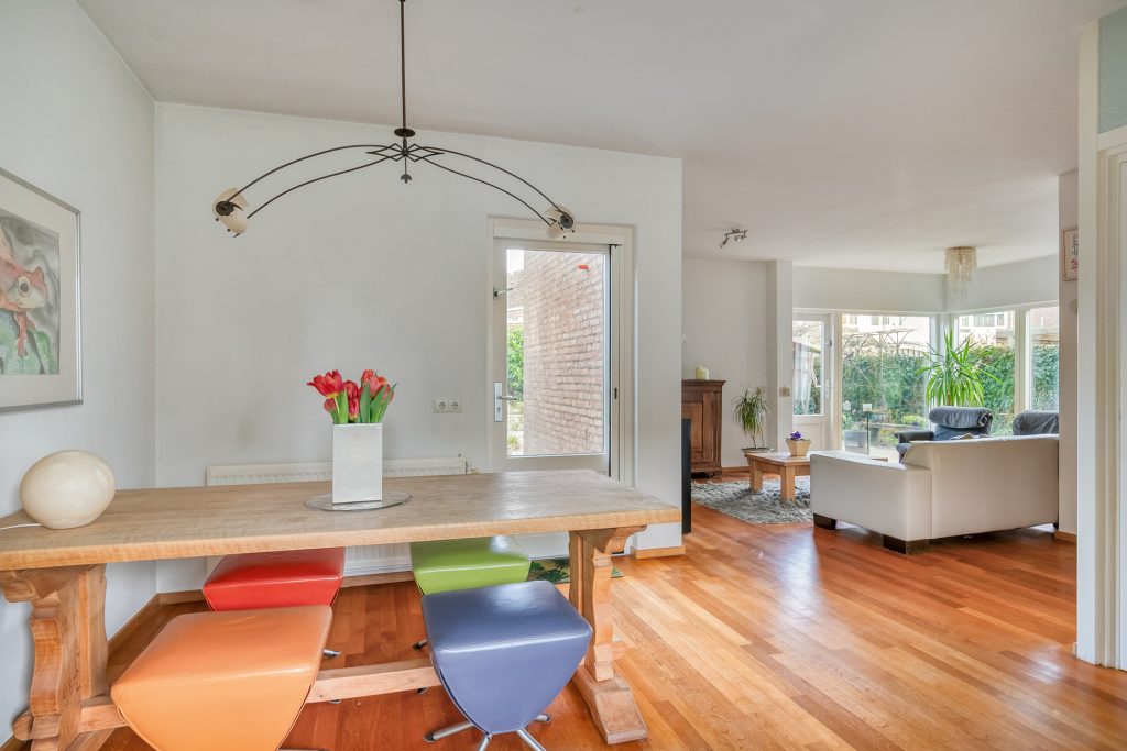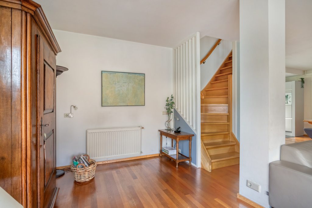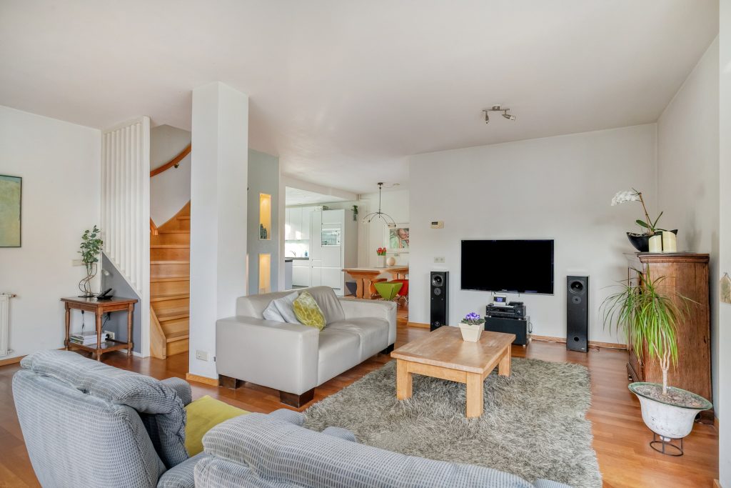 De speels ingedeelde woonkamer geniet volop lichtinval dankzij de vele vensters. Aan de achterzijde lopen deze door tot aan de grond, waardoor er goed zicht is op de achtertuin. De gehele kamer is in lichte tinten afgewerkt met stucwerk wanden en plafond en is voorzien van een parketvloer. In de woonkamer is de open trapopgang naar de 1e verdieping gelegen. Aan de woonkamer bevindt zich de eethoek met aangrenzend de keuken. Een deur geeft vanuit de eethoek toegang tot de tuin.