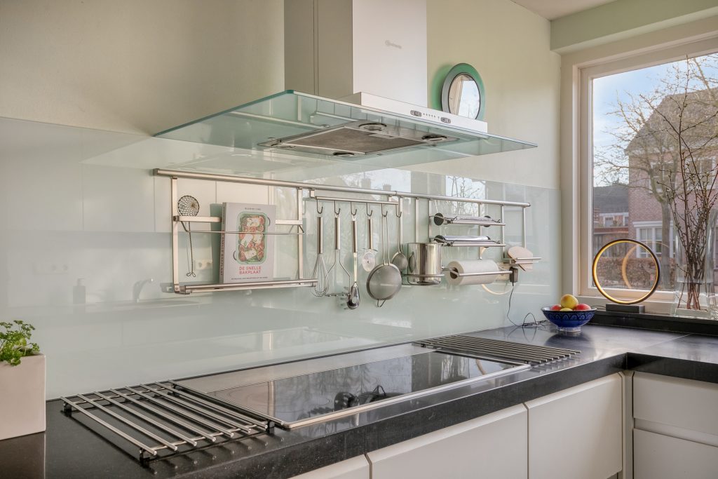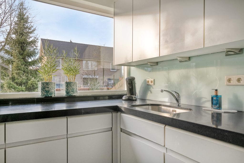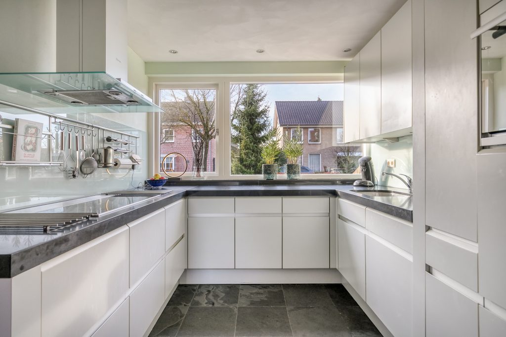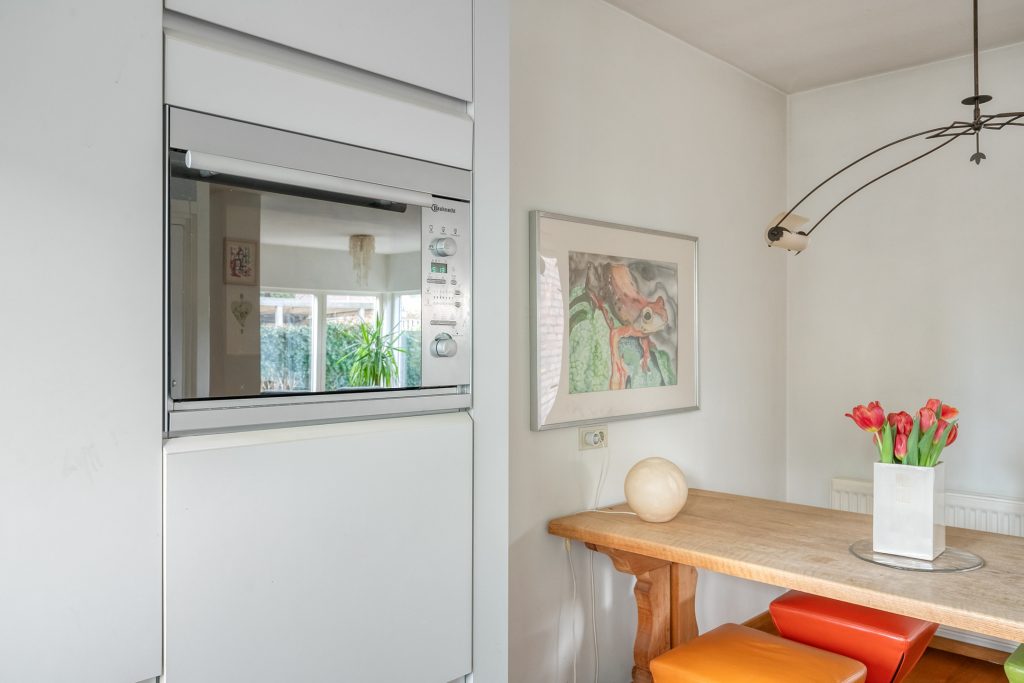 De moderne keuken is in carré-opstelling geplaatst en aan de voorzijde gelegen. Een groot venster geeft zicht op de voortuin. De keuken is compleet uitgerust met een vaatwasser, koelkast, keramische kookplaat, afzuigkap, combi-oven en spoelbak. Het ruime natuurstenen werkblad, de vele kastjes en lades maken de keuken een zeer praktische werkruimte. De keuken is voorzien van vloerverwarming.