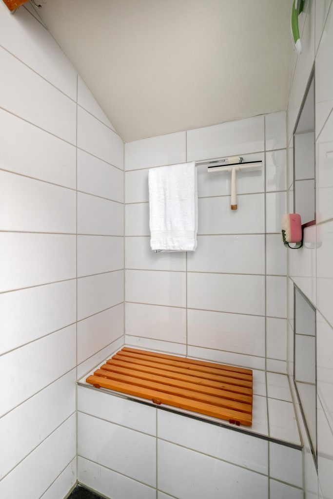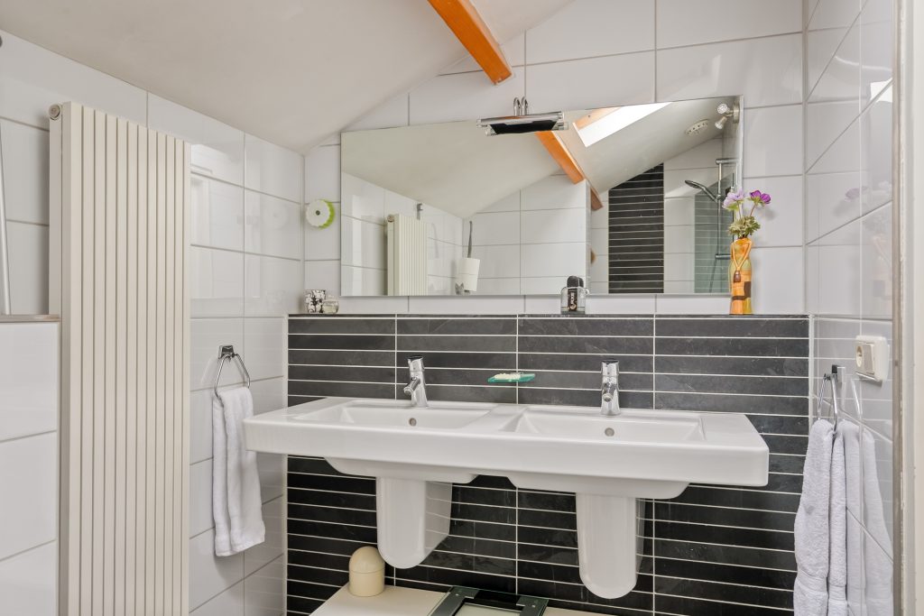 De gemoderniseerde badkamer beschikt over comfortabele vloerverwarming, een dubbele wastafel, inloopdouche en hangend toilet. Een dakvenstertje biedt natuurlijke lichtinval en ventilatie.