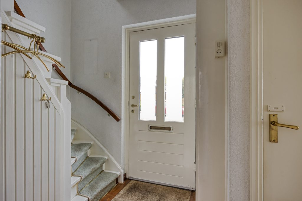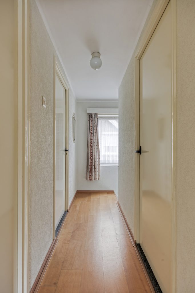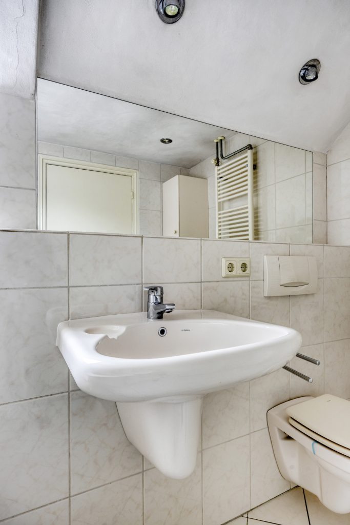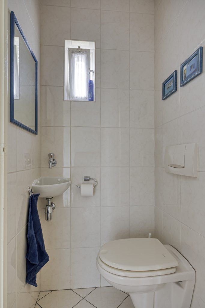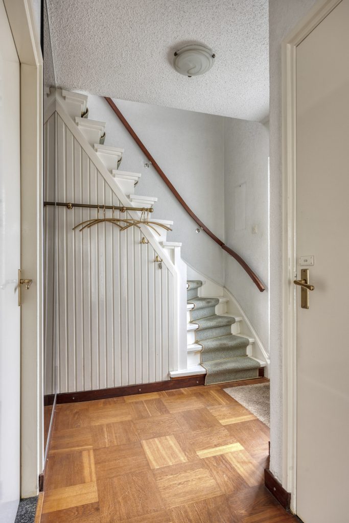 In de hal bevinden zich de meterkast, trapopgang en de toiletruimte met hangend toilet en hoekfonteintje.