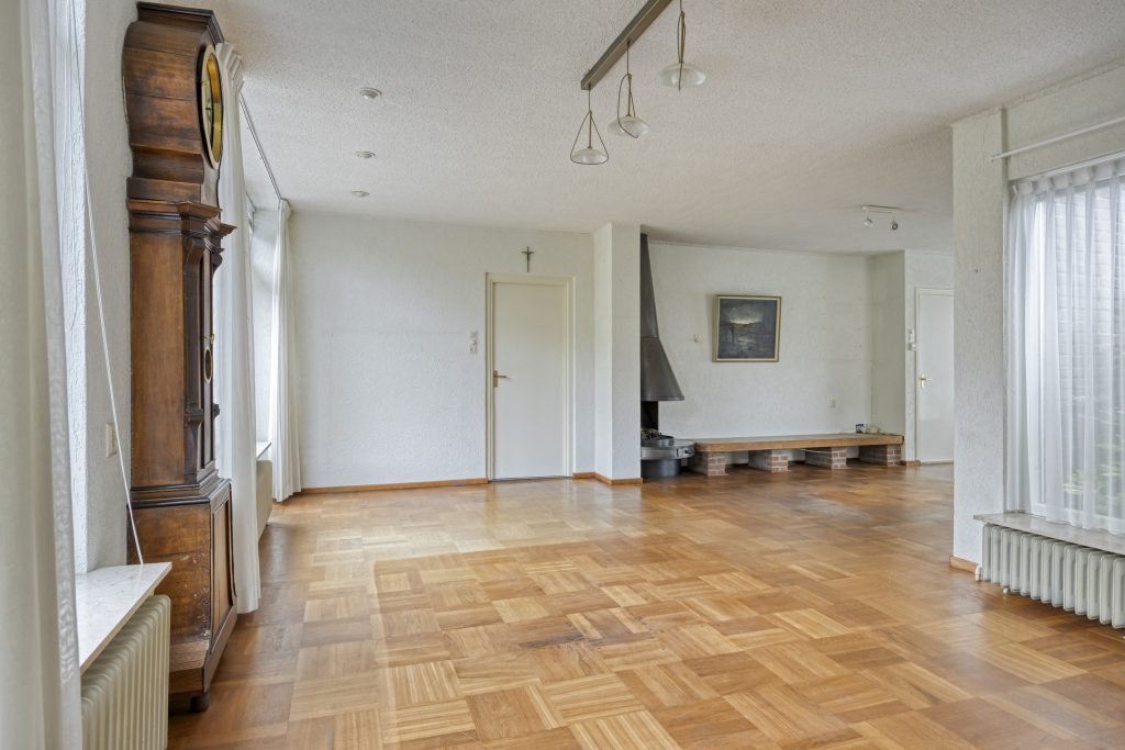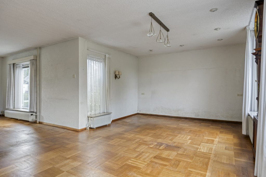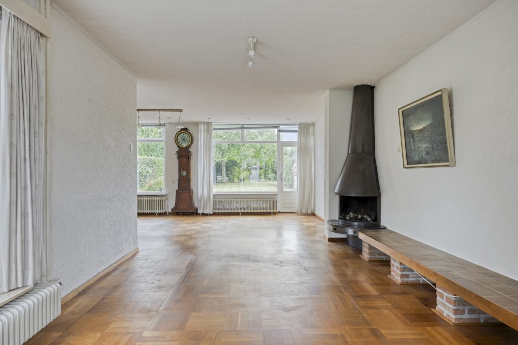 De woonkamer is aan de achterzijde uitgebouwd waardoor er ca. 42 m2 gebruiksoppervlakte aanwezig is. De kamer is deels voorzien van een houten balklaag, deel betonnen vloer, belegd met een blokparketvloer. De kamer is in lichte kleurstelling uitgevoerd en geniet volop lichtinval en heeft mooi zicht op de achtertuin. In de kamer is een openhaardpartij aanwezig.