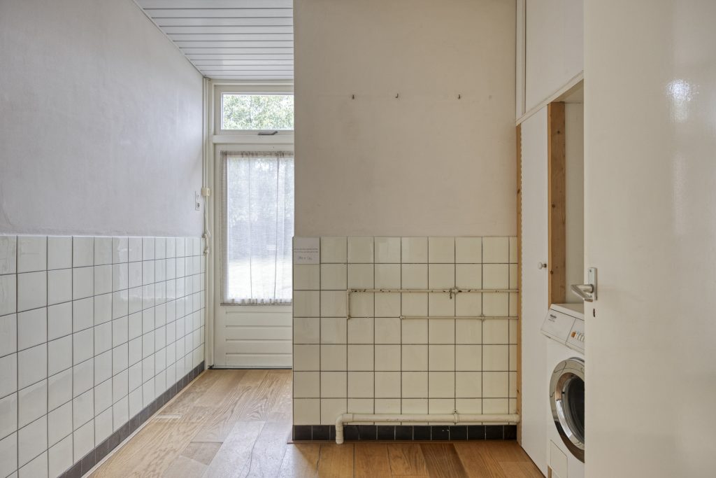 Aan de keuken ligt de bijkeuken met een vaste kast, wasmachine aansluiting en een doucheruimte met douchebak en wastafel.