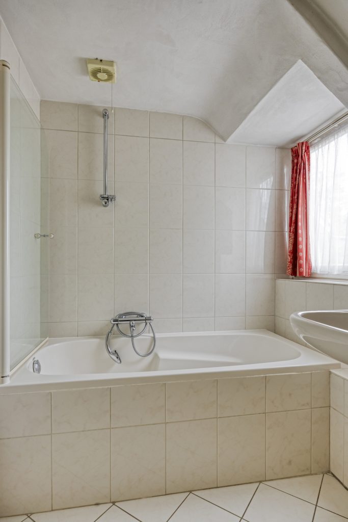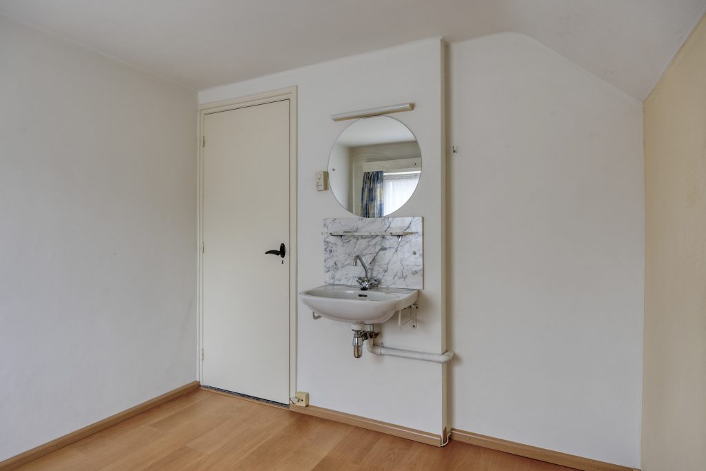 De overloop op de 1e verdieping geeft toegang tot 3 slaapkamers en de badkamer. Op 1 van de slaapkamers is een wastafel aanwezig, op een 2e slaapkamer is een vaste kast gemaakt. De overloop en 2 slaapkamers zijn voorzien van een laminaatvloer. De 3e slaapkamer is afgewerkt met een grenen houten vloer. De badkamer heeft een ligbad met glazen douchescherm, wastafel en een hangend toilet.