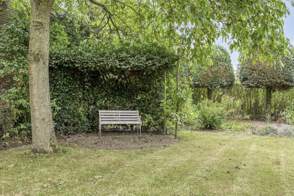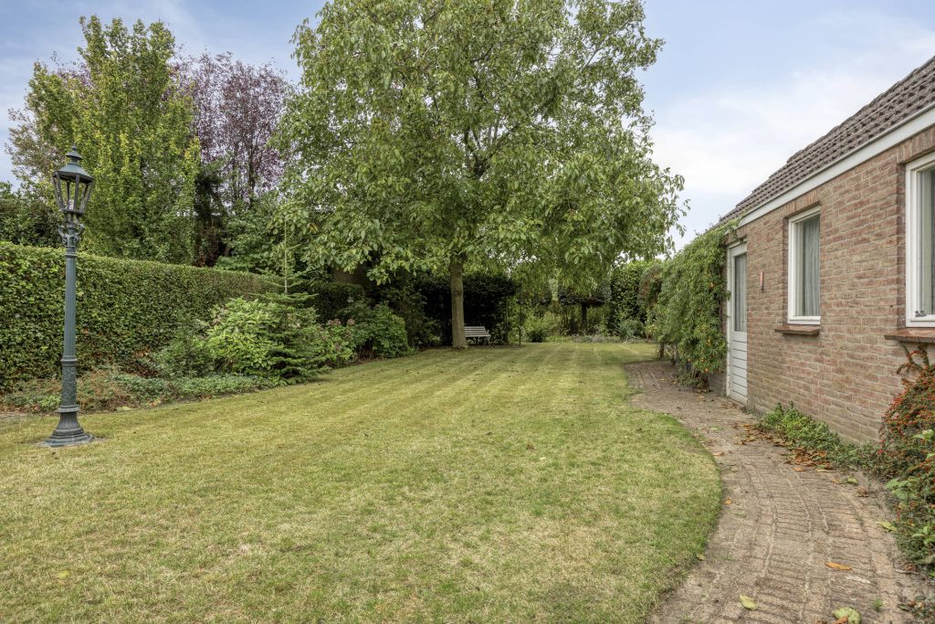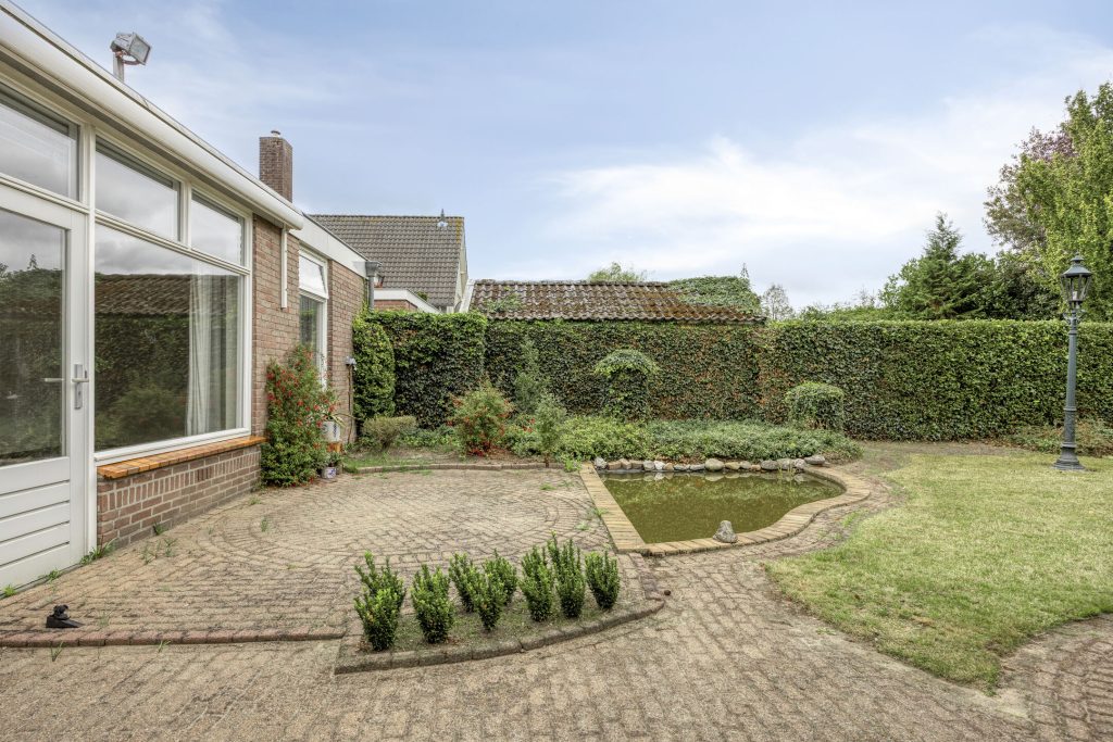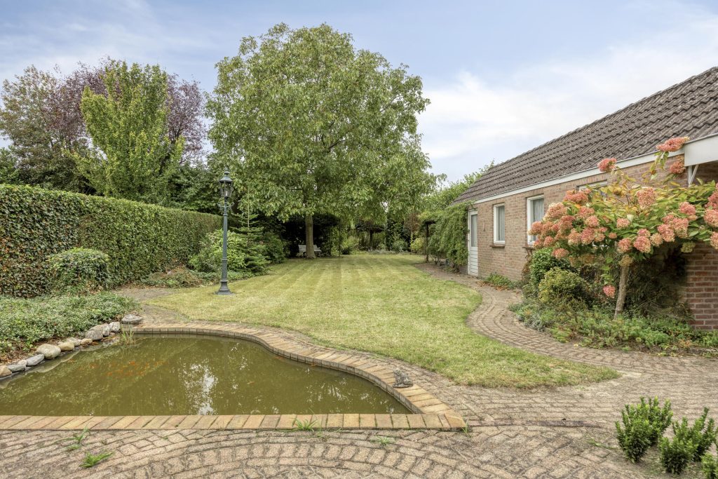 De royale achtertuin heeft een bestraat terras met zonneluifel aan de woning, vijverpartij, grootgazon, volwassen bomen en diverse borders. De tuin is zeer diep en is gelegen op het zuid-westen. In de tuin is de ruime, extra lange garage gelegen met aan de voorzijde de carport met garagedeur en aan de achterzijde een 2e overkapping. De garage beschikt over verlichting, elektra en een uitstortgootsteen met water. De schuine kap zorgt voor de aanwezigheid van een bergzolder.