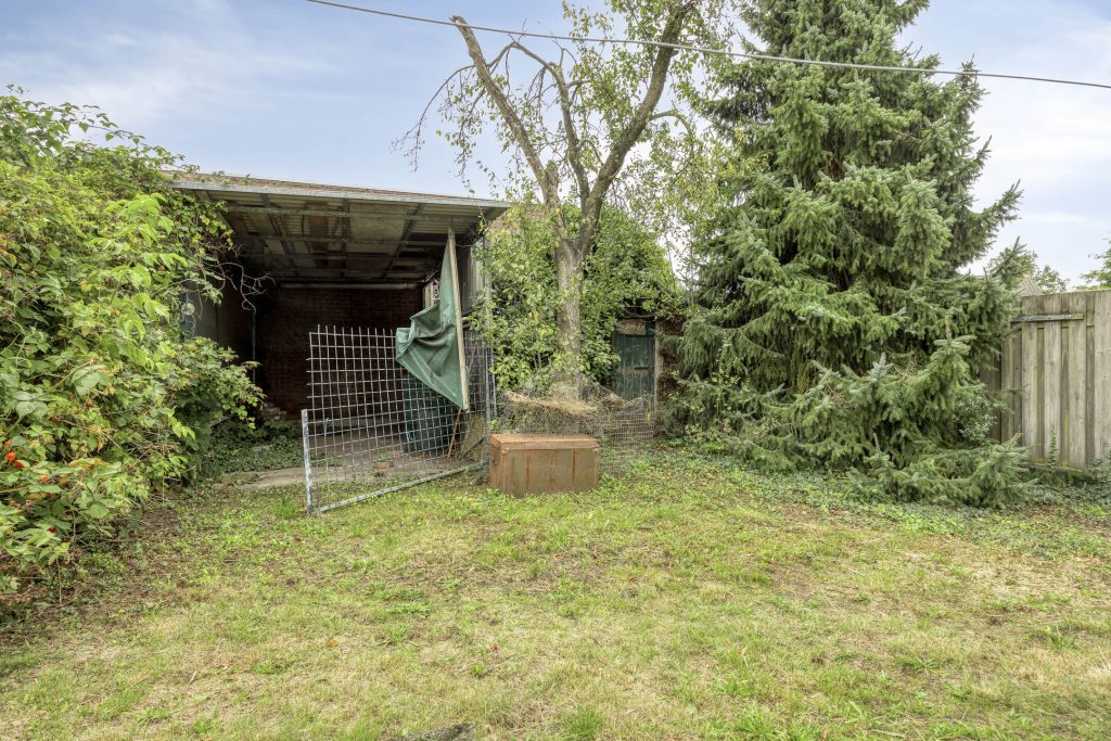 De diepe achtertuin is gelegen op het zuid-westen. De woning is gebouwd in 1960, daarna uitgebouwd en behoeft modernisering.