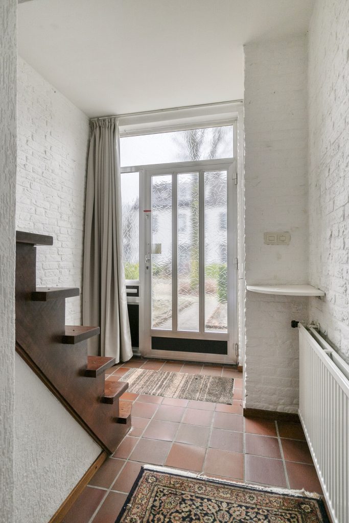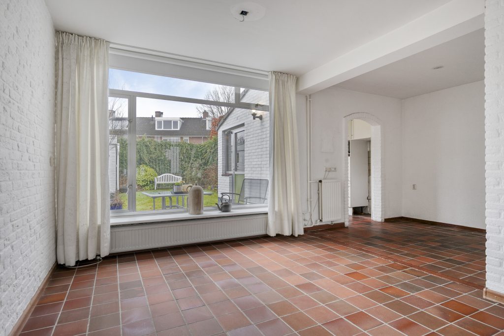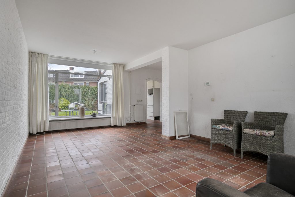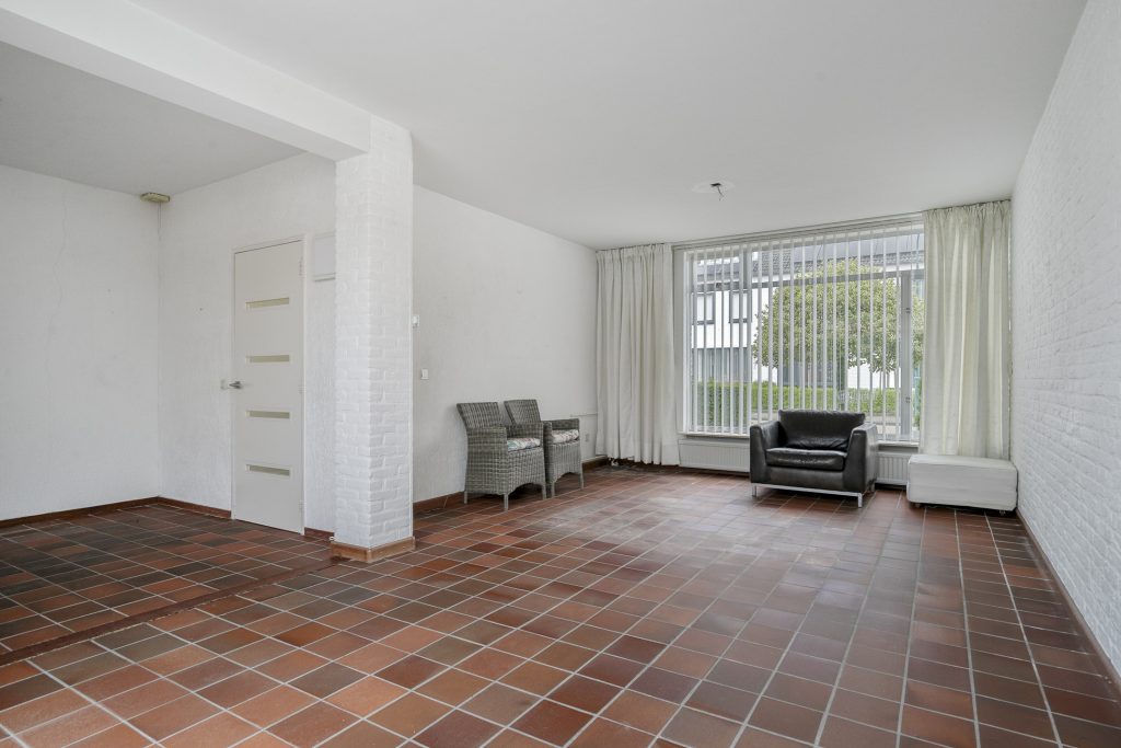 In de hal bevinden zich de meterkast, praktische trapkast, toiletruimte en de trapopgang naar de 1e verdieping. Vervolgens is de L-vormige woonkamer toegankelijk die voorzien is van een tegelvloer. De woonkamer is voorzien van aluminium kozijnen met isolerende beglazing en is volledig in lichte tinten afgewerkt.