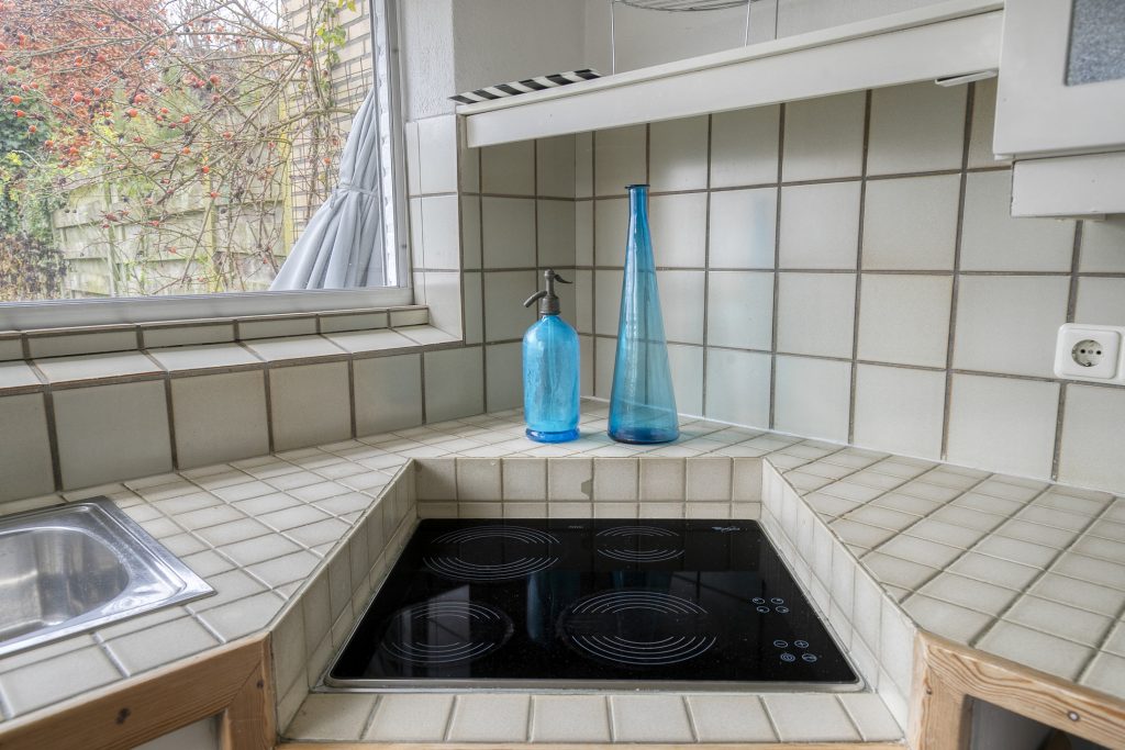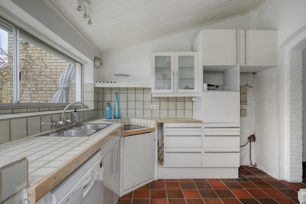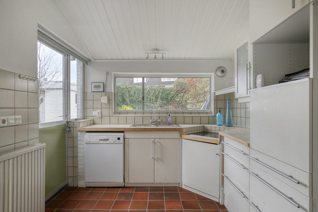 Aan de woonkamer is in een uitbouw de keuken gelegen. De eenvoudige keukeninrichting is in hoekopstelling geplaatst en voorzien van een betegeld werkblad, onder- en bovenkastjes, dubbele spoelbak, keramische kookplaat en losse vaatwasser. Er is mooi zicht op de achtertuin en via een deur is de tuin toegankelijk.