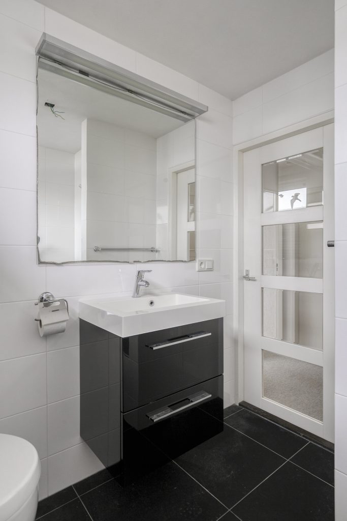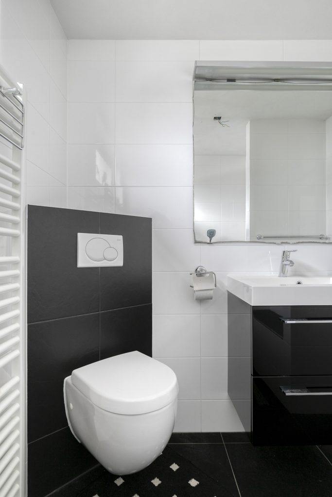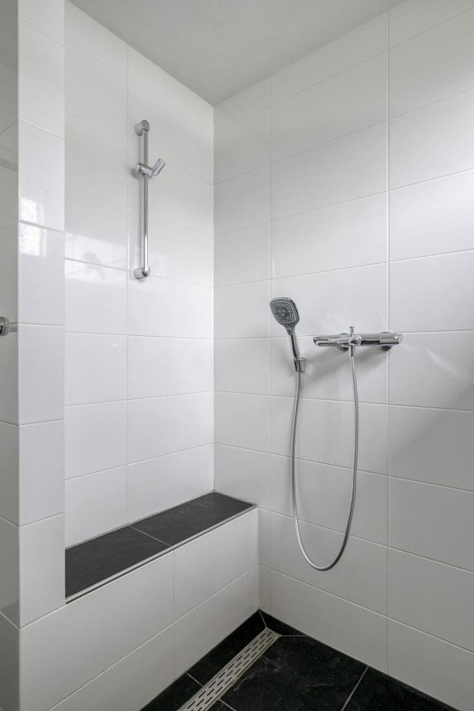 De badkamer is volledig betegeld en voorzien van een inloopdouche, wastafelmeubel, hangend toilet en designradiator.