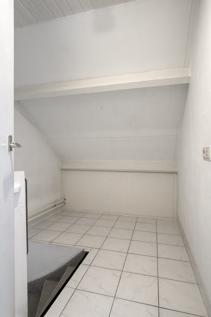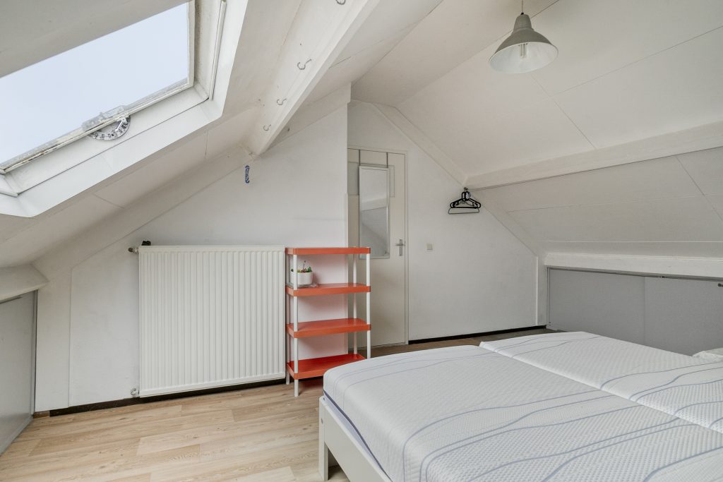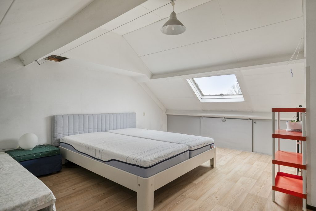 Een vaste trap geeft toegang tot de betegelde overloop op de 2e verdieping. Hier is toegang tot een cv-/wasruimte en de zolderkamer. In de cv-ruimte zijn witgoedaansluitingen aanwezig en bevindt zich de Remeha cv-ketel uit 2019. De ruime zolderkamer, slaapkamer 4, geniet lichtinval dankzij een dakvenster en heeft bergruimte onder het knieschot.