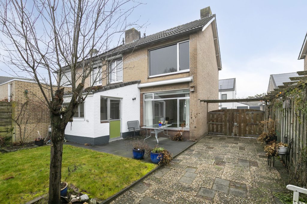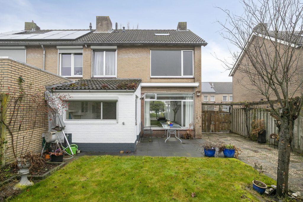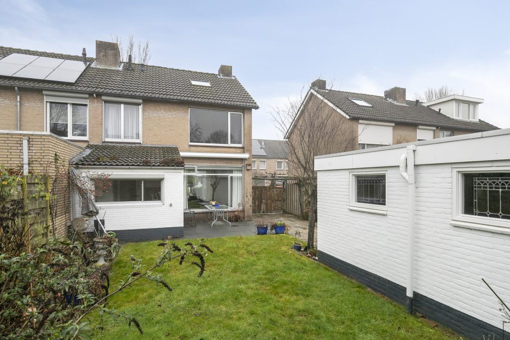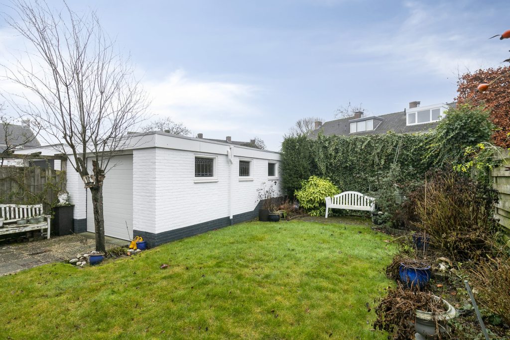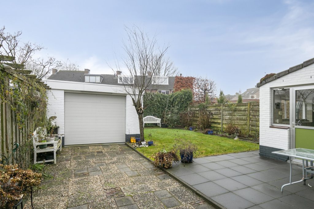 De achtertuin is gelegen op het zuiden en is aangelegd met een bestraat terras aan de woning met zonneluifel. Verder zijn er een gazon, borders en een achterom naar de oprit aanwezig. In de tuin is de garage gelegen voorzien van elektra en een elektrisch bedienbare sectionaaldeur. Voor de garage is de oprit gelegen, afsluitbaar via een poort.