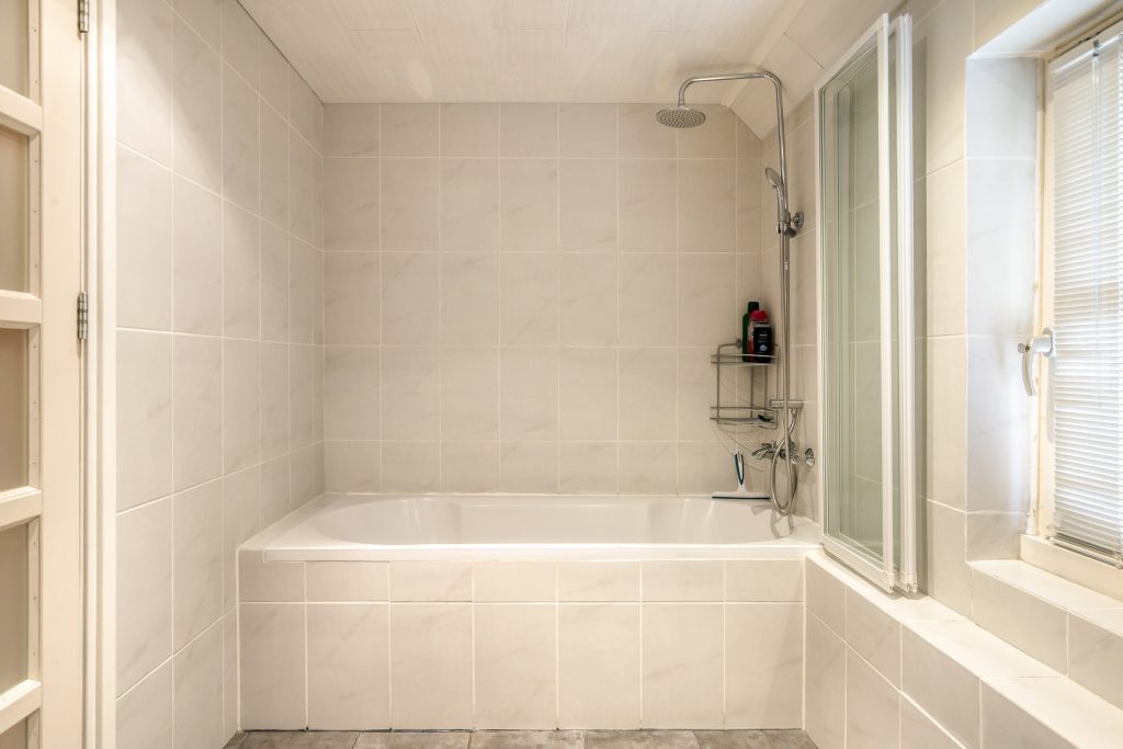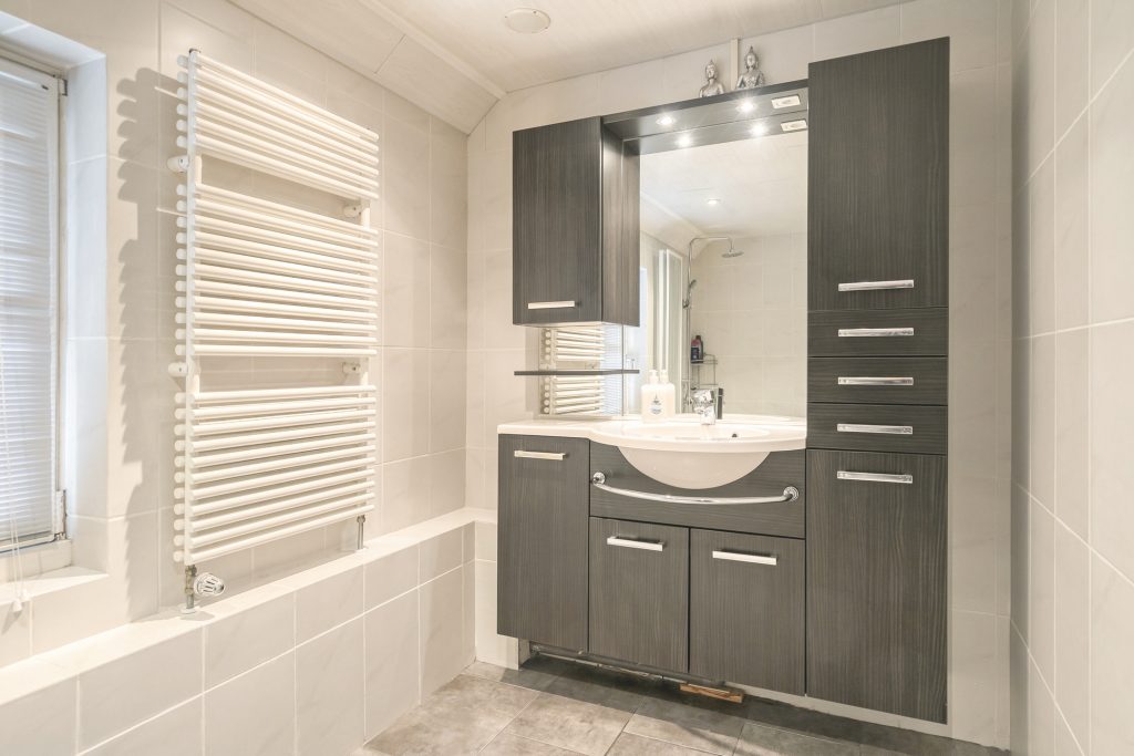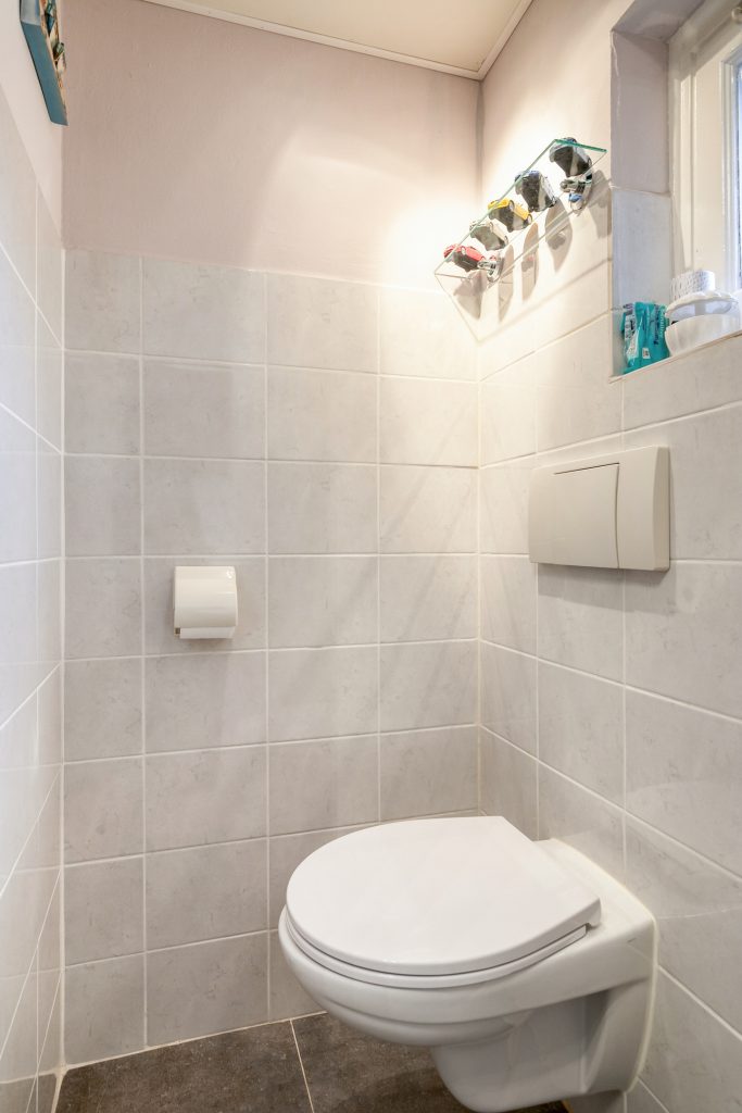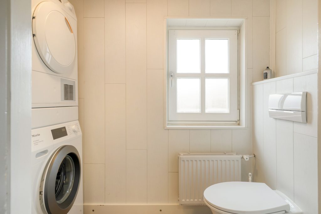 De badkamer is volledig betegeld en voorzien een wastafelmeubel, ligbad/ douchecombinatie en een designradiator. In de separate toiletruimte zijn naast een hangend toilet ook de aansluitingen voor witgoed aanwezig.