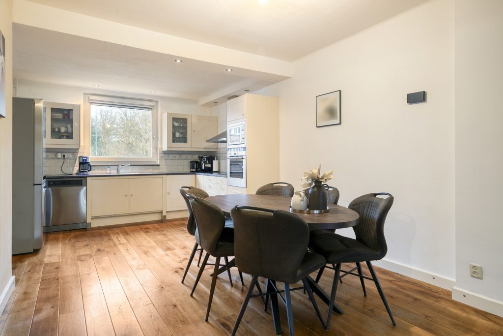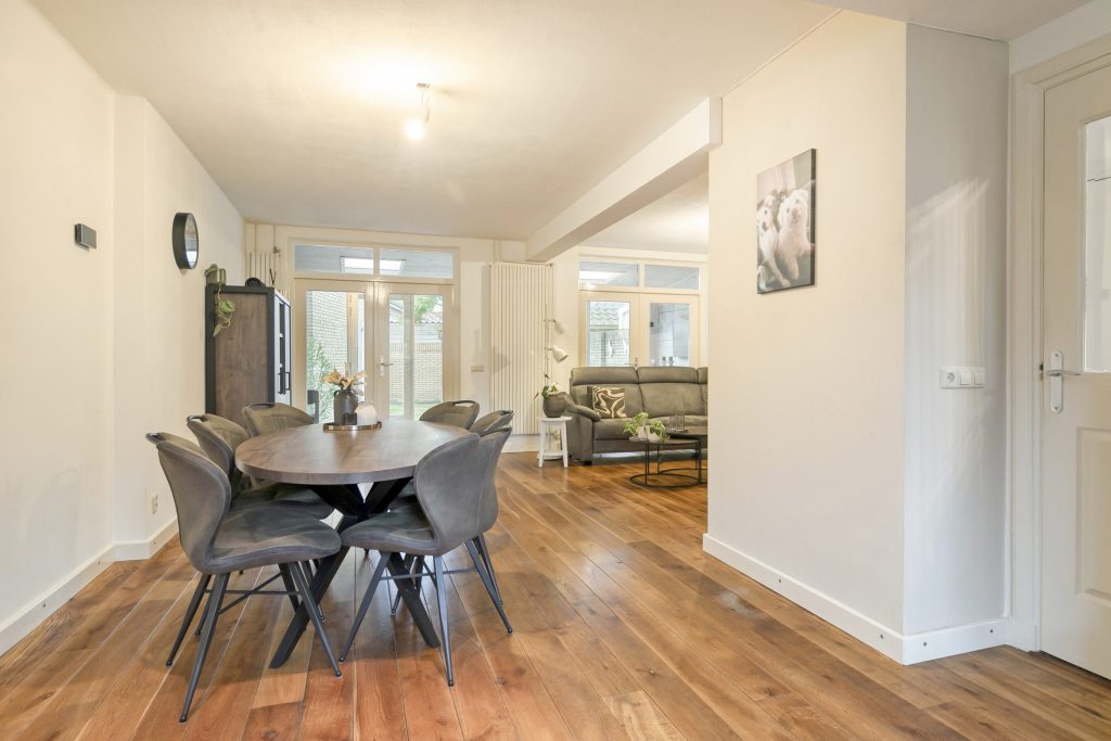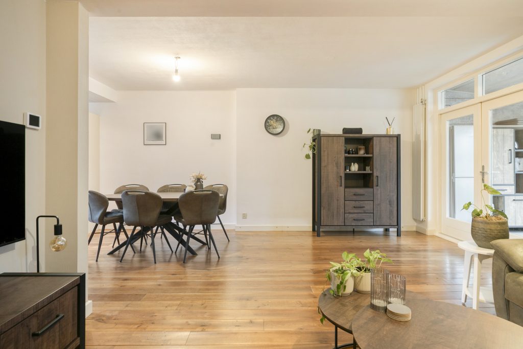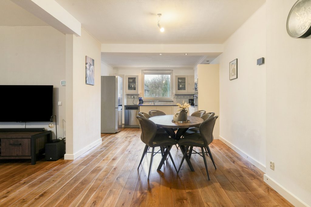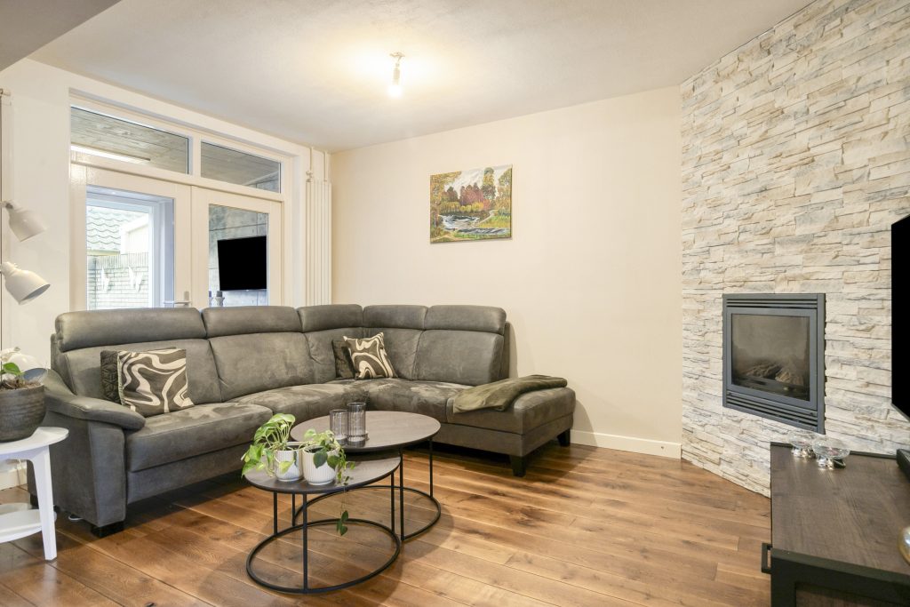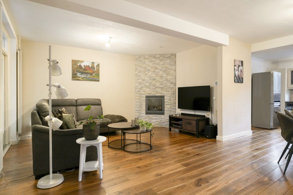 Aangrenzend bevindt zich de ruime woonkamer met dubbele openslaande tuindeuren naar de aanbouw. In de woonkamer is een gashaard aanwezig. De keuken en woonkamer zijn voorzien van een houten vloer en grotendeels stucwerk wand- en plafondafwerking.