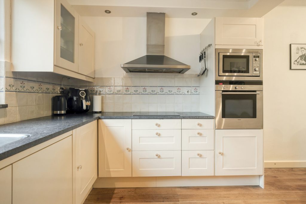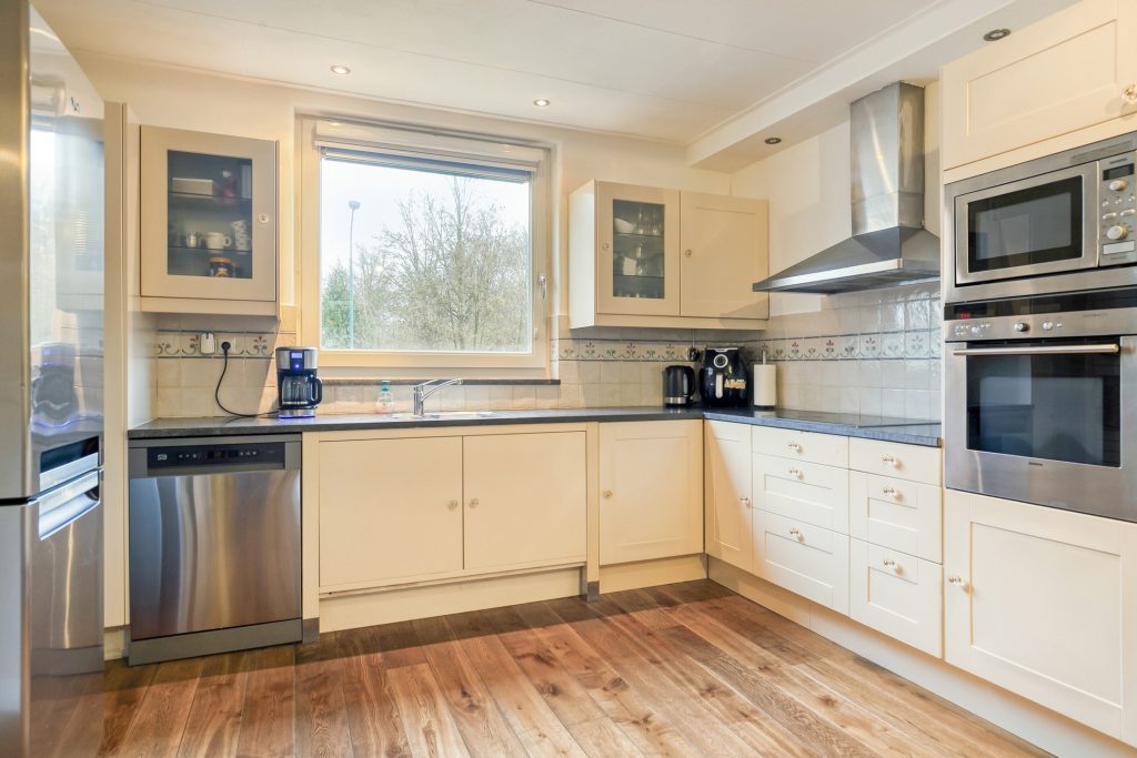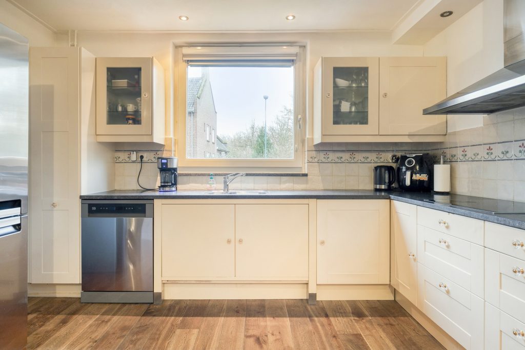 De open keuken is aan de voorzijde van de woning gelegen en beschikt over een hoekopstelling met onder- en bovenkasten, lades, een spoelbak, close-in-boiler, inductiekookplaat met rvs afzuigkap, oven, magnetron, vaatwasser en een losse koelkast met vrieslades. Er is inbouwverlichting aanwezig in koven en een venster geeft aan de voorzijde zicht op de “Muziektuin”.
