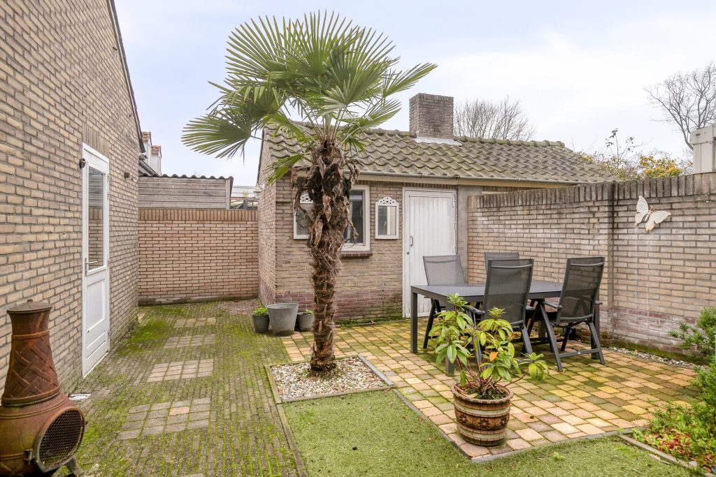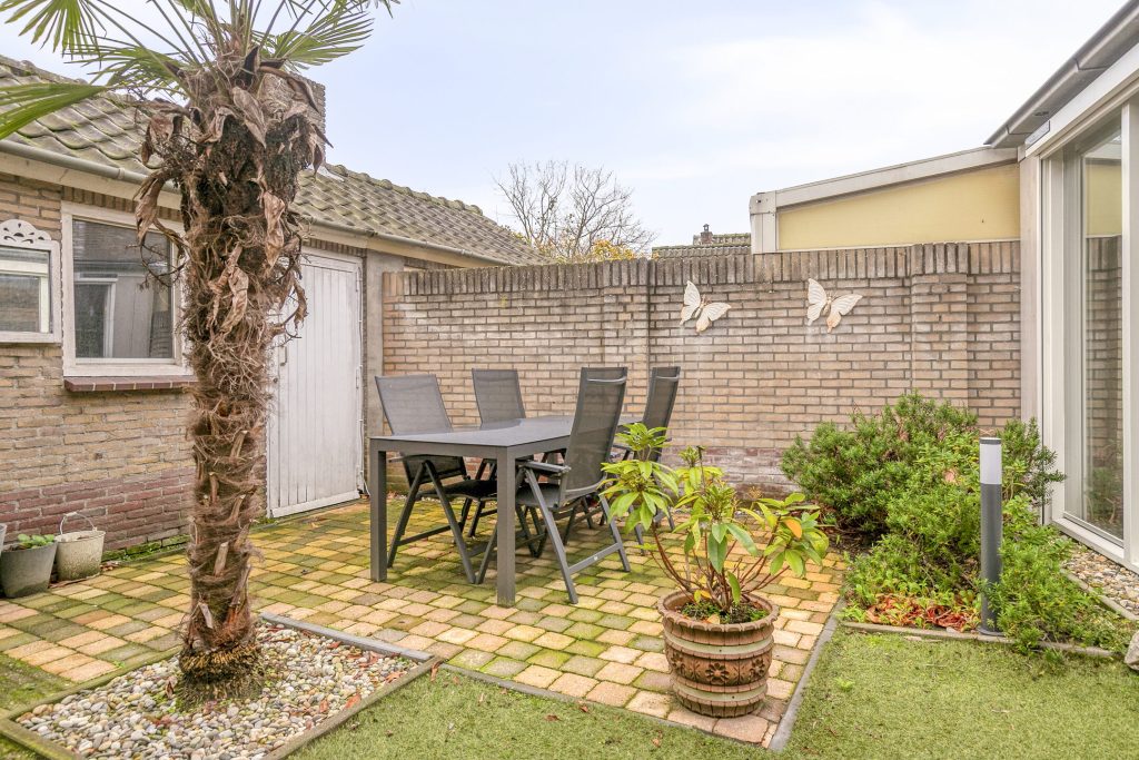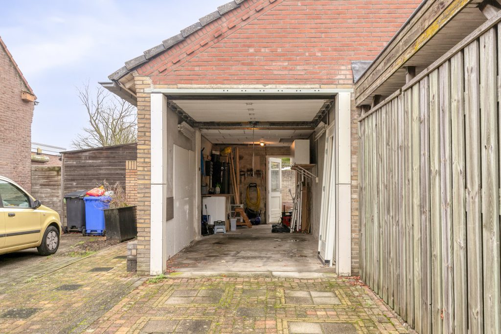 De knusse achtertuin is volledig omheind, aangelegd met bestrating, bordertjes en geeft toegang tot de berging en de garage. Middels een achterom met poort is de oprit bereikbaar. Door de ligging op het zuiden kan er in het voorjaar en najaar volop van de zon worden genoten. De stenen berging beschikt over elektra. De verrassende garage heeft een elektrisch bedienbare sectionaaldeur naar de oprit, waar een eigen parkeerplaats gelegen is. Een losse trap geeft toegang tot een verrassende bergzolder.