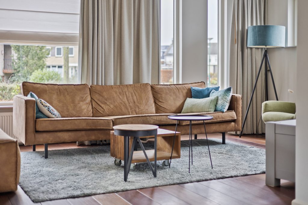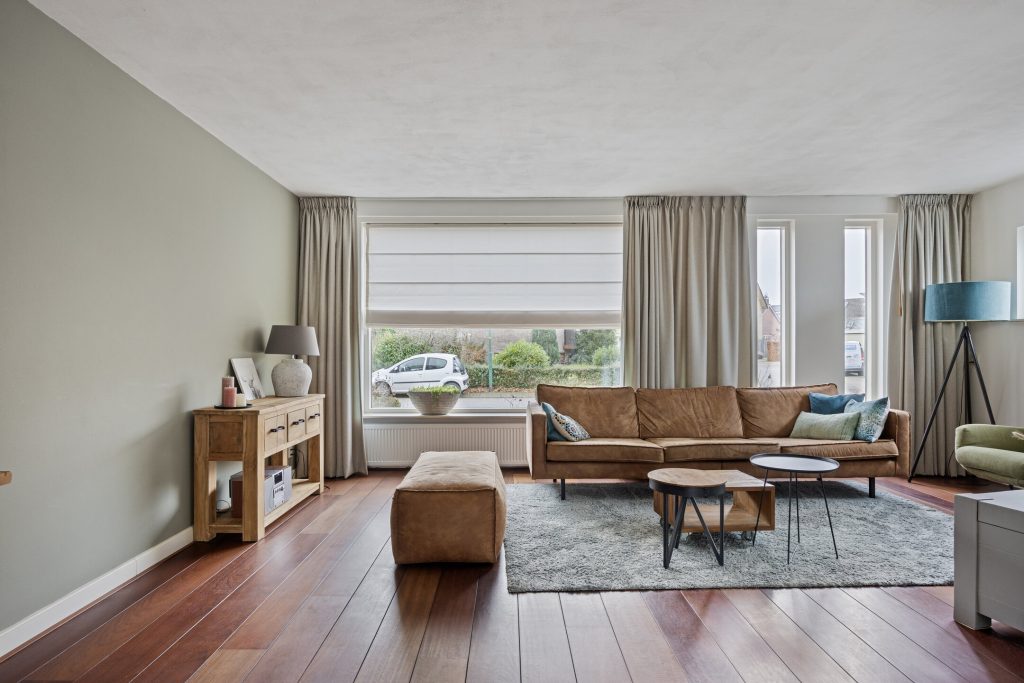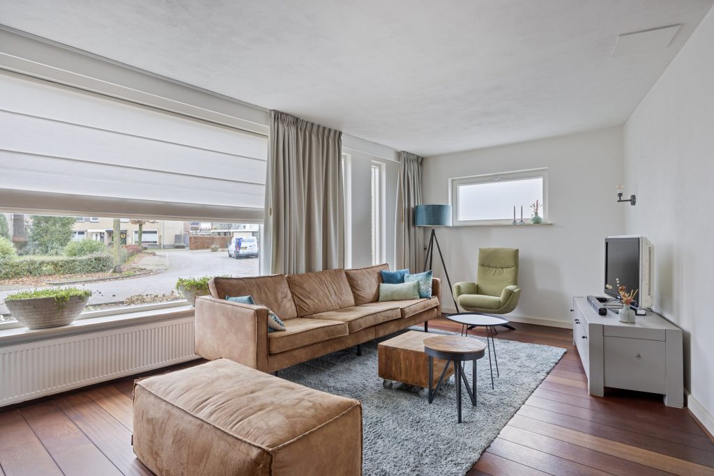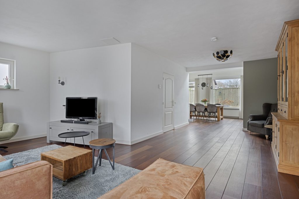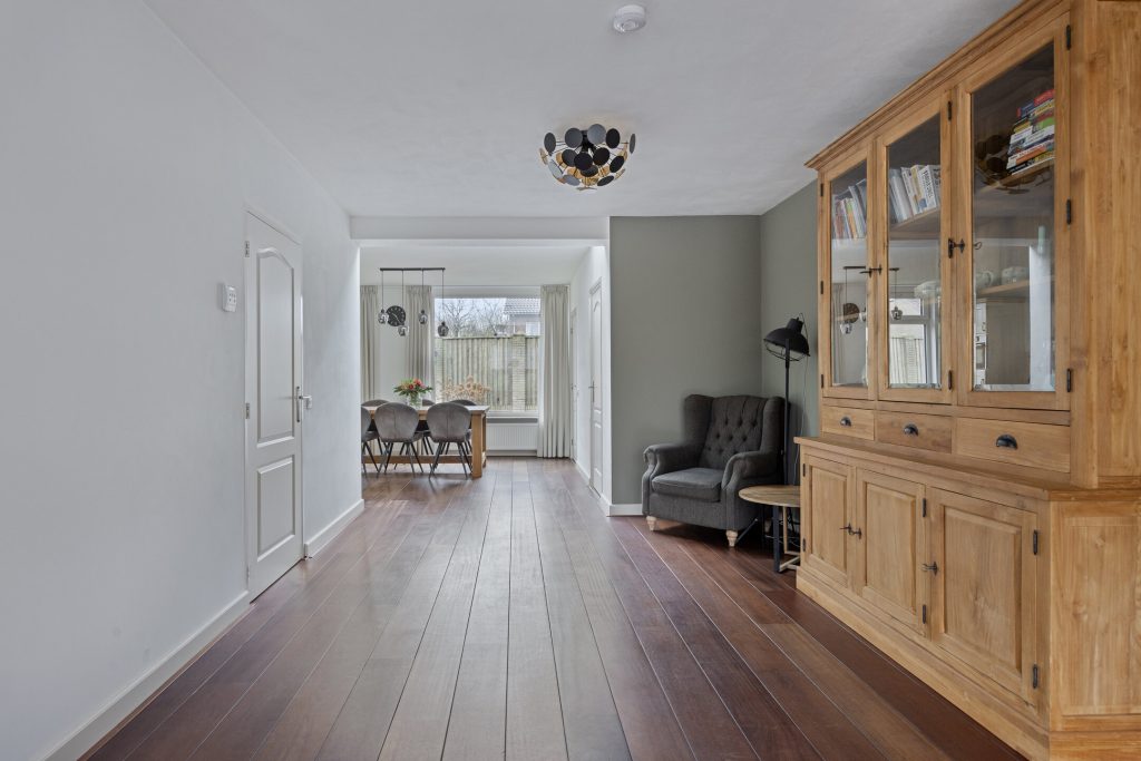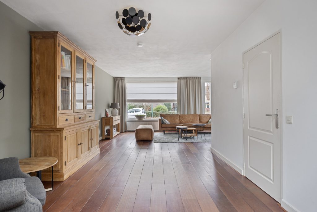 De L-vormige woonkamer is volledig gestucadoord en voorzien van een Jatoba houten vloer.