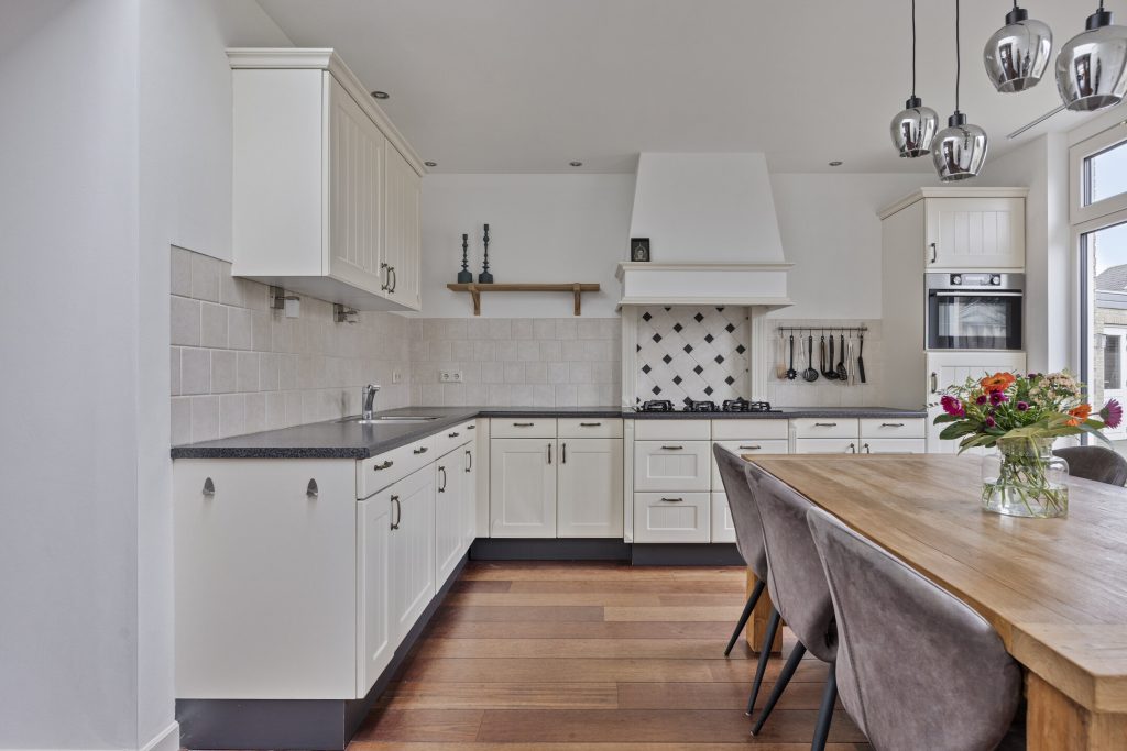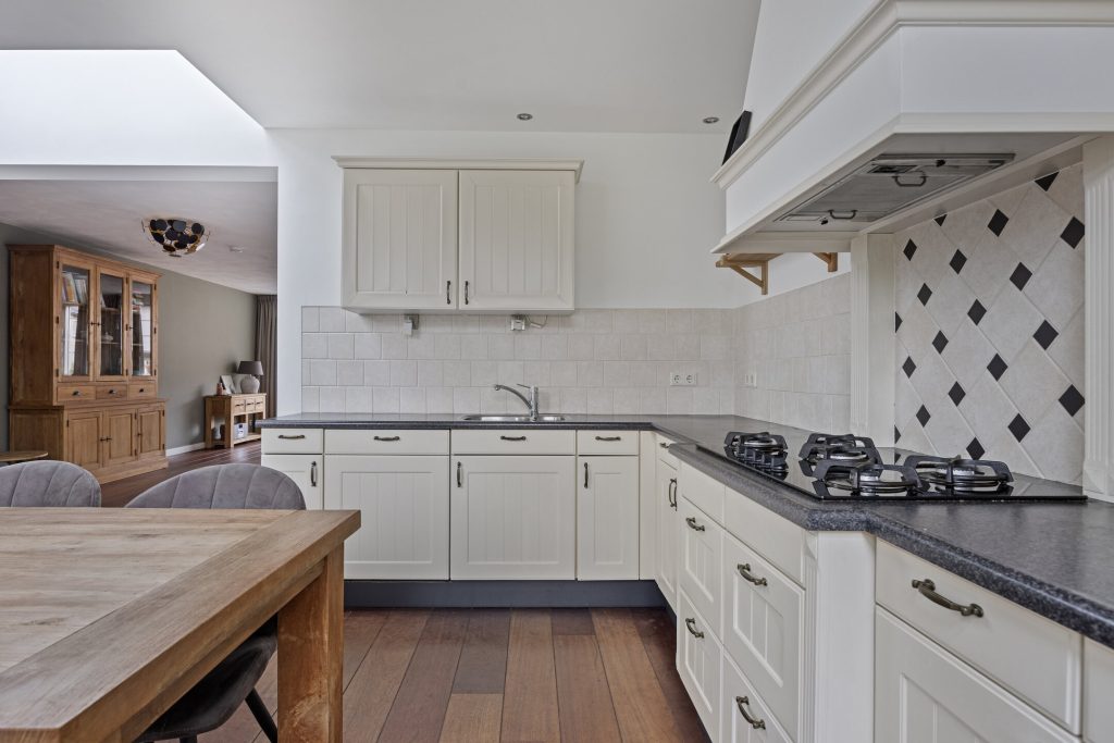 De open keuken in hoekopstelling is voorzien van een kunststof aanrechtblad, 5-pits gaskookplaat, afzuigkap in schouw, koelkast, combi-magnetron en een vaatwasser.