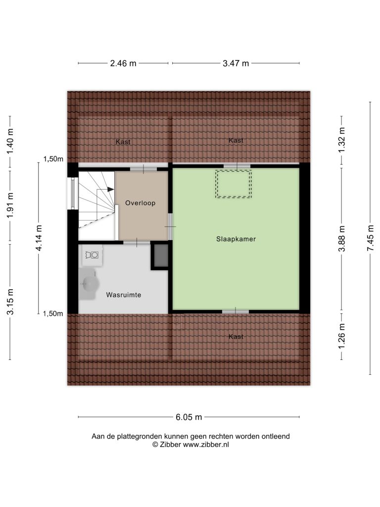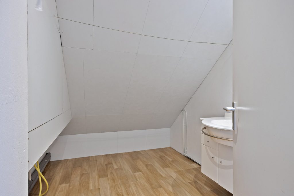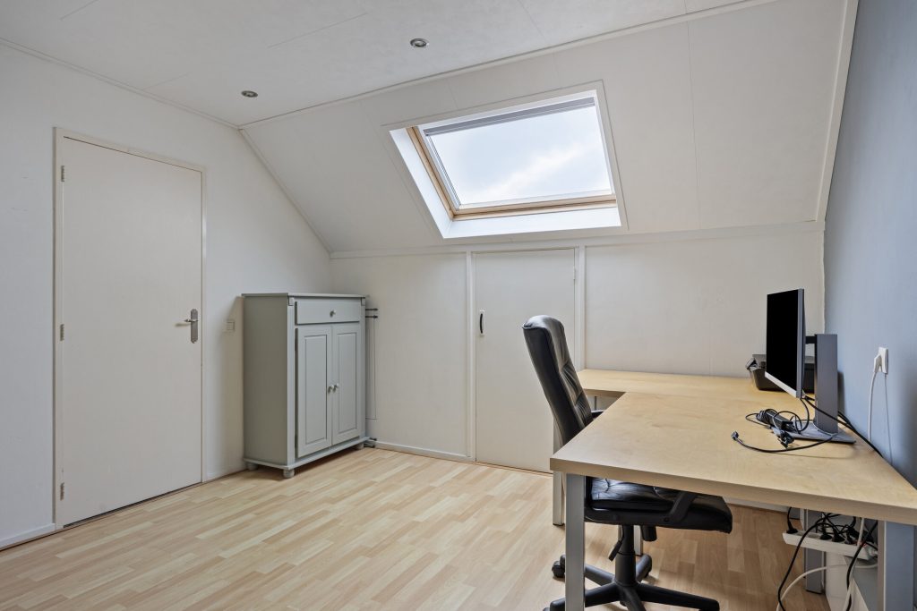 Vervolgens is een zolderkamer te bereiken die is voorzien van een dakvenster. Deurtjes geven toegang tot bergruimtes onder de kapschuinte.