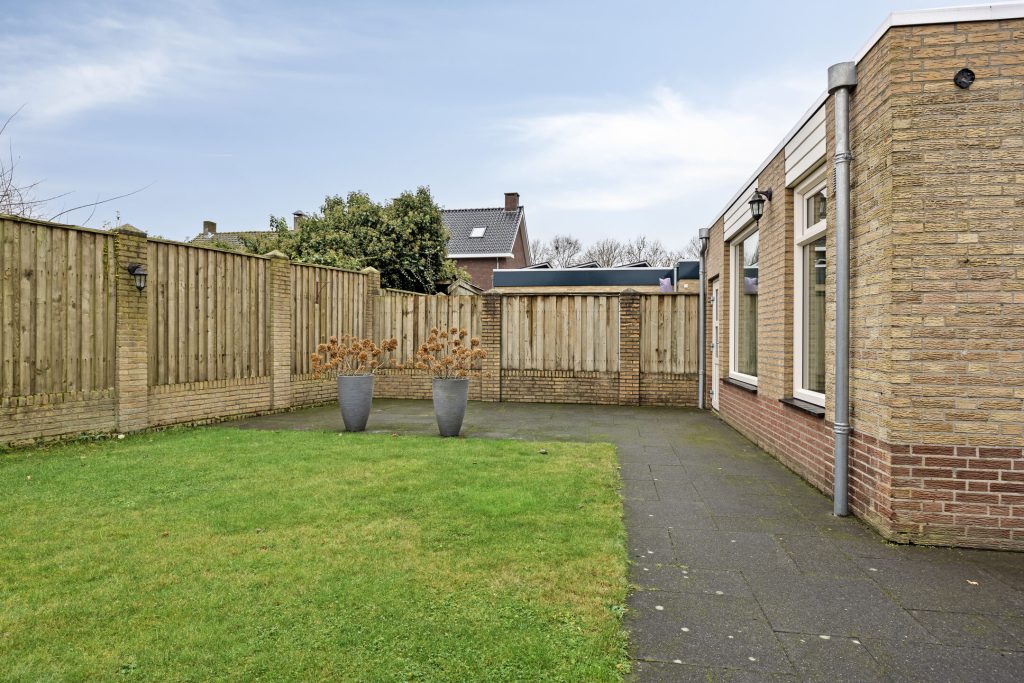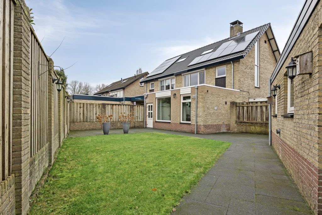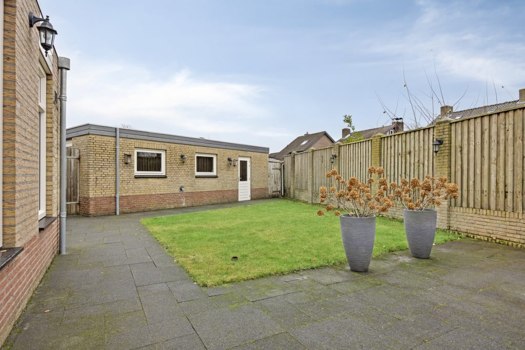 Achter de woning heeft u de beschikking over een onderhoudsvriendelijke achtertuin welke is ingericht met een bestraat terras, gazon en een achterom naar de brede oprit.