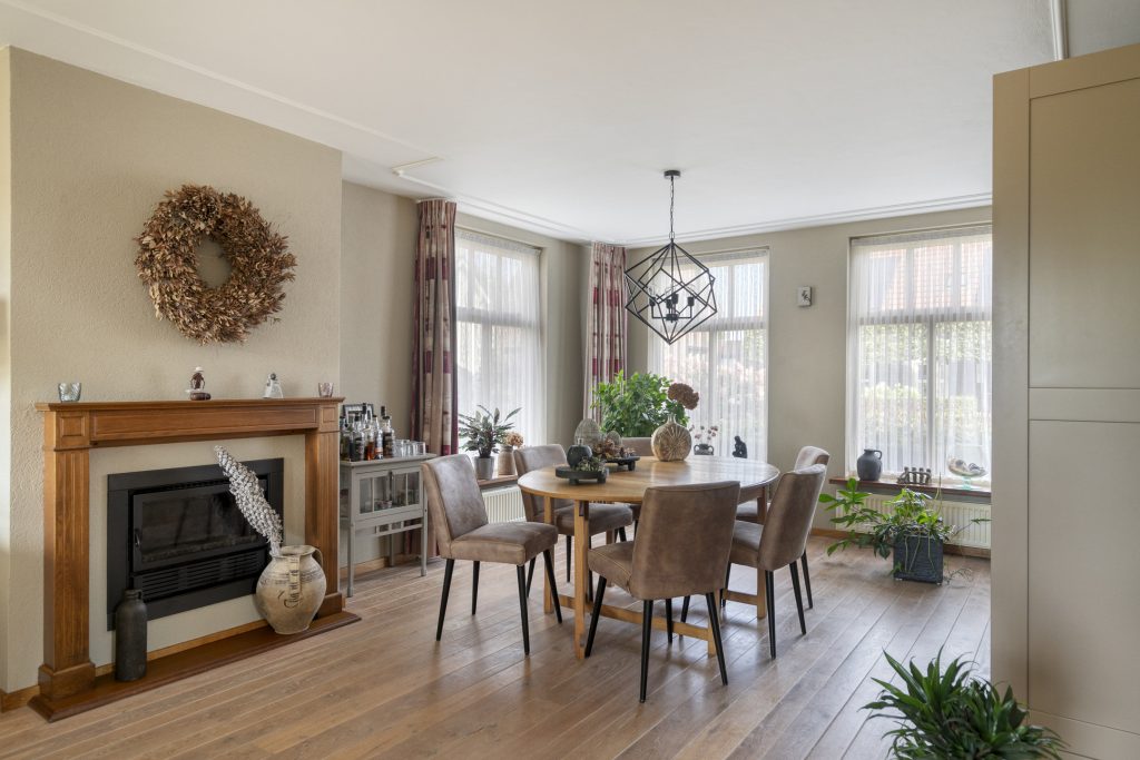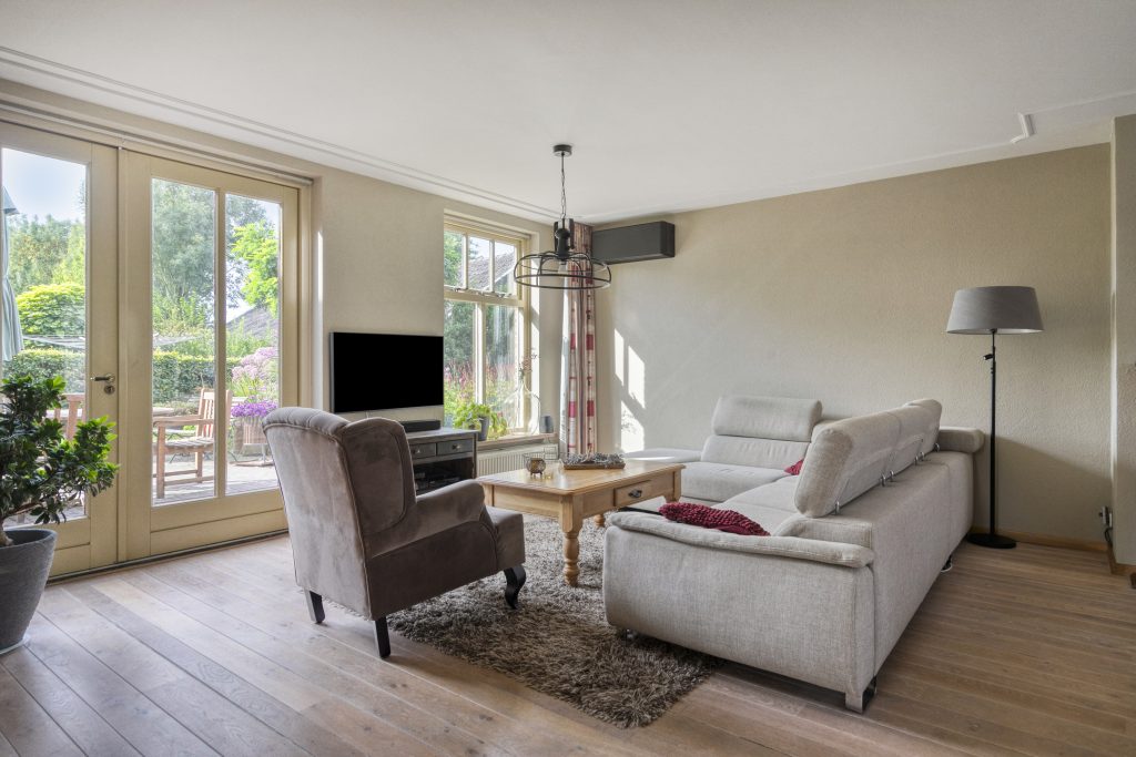 De woonkamer is erg licht te noemen vanwege de vele raampartijen aan zowel de voor- als achterzijde, maar ook aan de zijkant van de woning. Aan de achterzijde zijn dubbele openslaande tuindeuren aanwezig met toegang tot de achtertuin. Vanwege de grote hoeveelheid ruimte is de woonkamer gemakkelijk in te delen met een zitgedeelte en een eetgedeelte. Een schouw met een houtkachel zorgt ervoor dat het extra warm is tijdens de koude winterdagen.