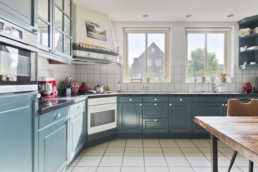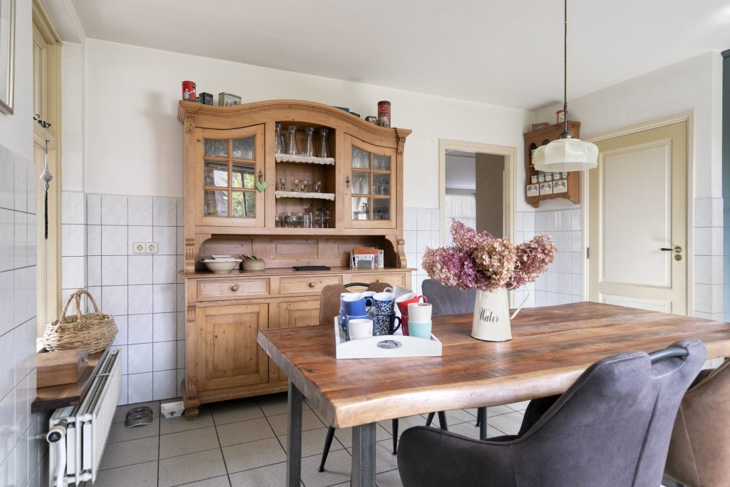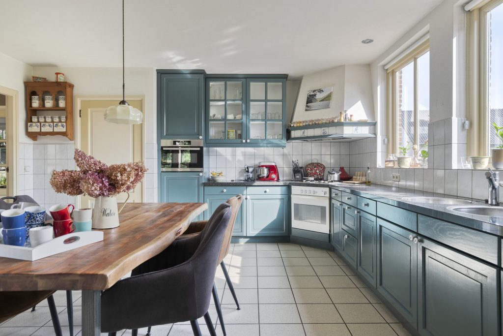 De woonkeuken is vanuit de woonkamer te bereiken en de keuken is geplaatst in een hoekopstelling en is afgewerkt met een natuurstenen granieten aanrechtblad. De inbouwapparatuur bestaat uit onder andere een gaskookplaat, een afzuigkap, een koelkast, een combi-magnetron, een elektrische bakoven en een vaatwasser. In de keuken is voldoende ruimte om tevens een eettafel te plaatsen en achter een deur bevindt zich een praktische kelder.