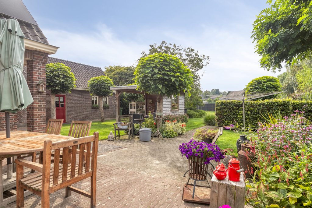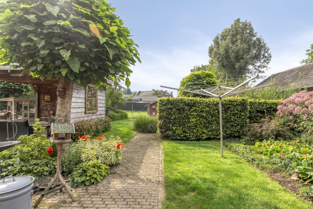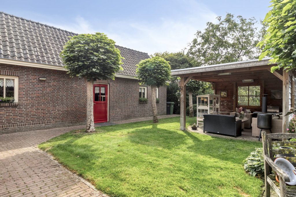 Achter de woning heeft u de beschikking over een gezellige en groene achtertuin. De tuin is ingericht met een terras, ene gazon en een diverse volwassen beplantingen. In het midden van de tuin treft u een gezellige overkapping aan voorzien van verlichting en twee warmtelampen. Hier kunt u tijdens de regenachtige dagen ook van uw tuin genieten. Als laatste noemen we vrijstaande houten berging helemaal achterin de tuin. Deze is ideaal geschikt voor de opslag van uw tuingereedschap.