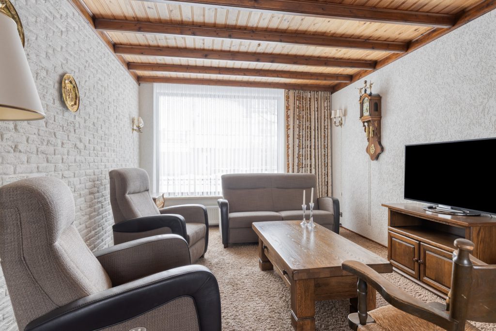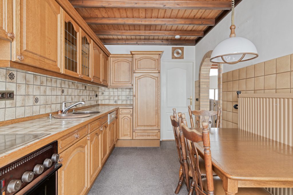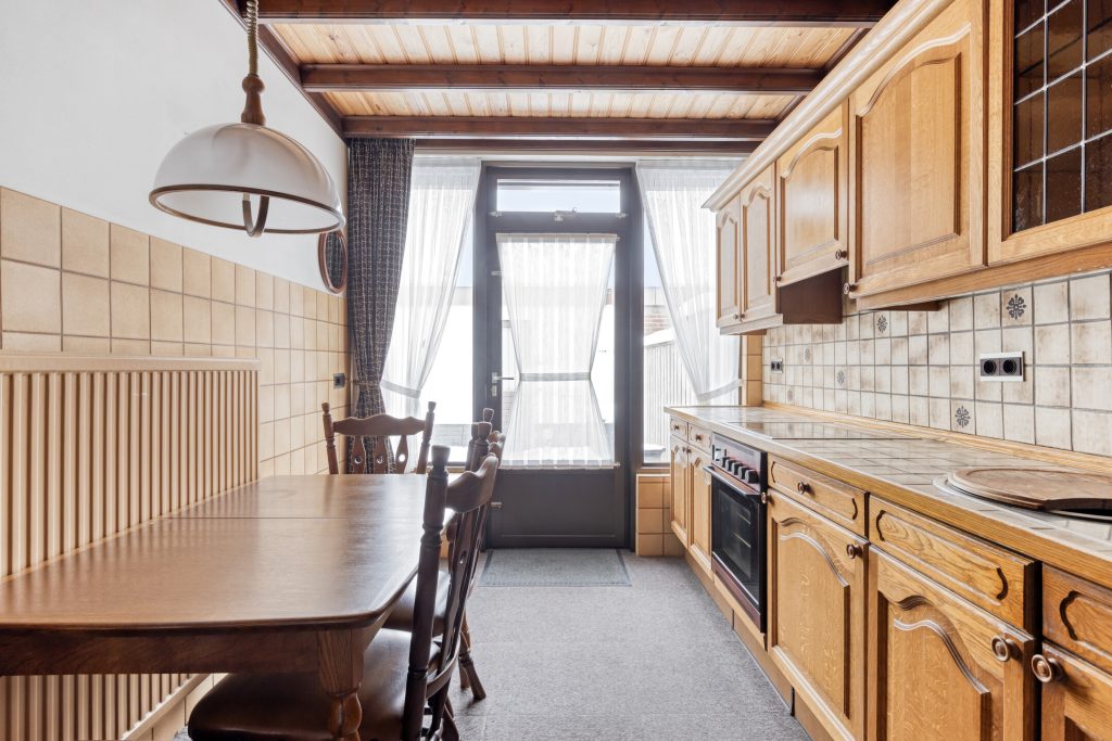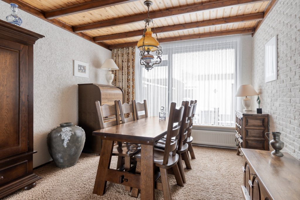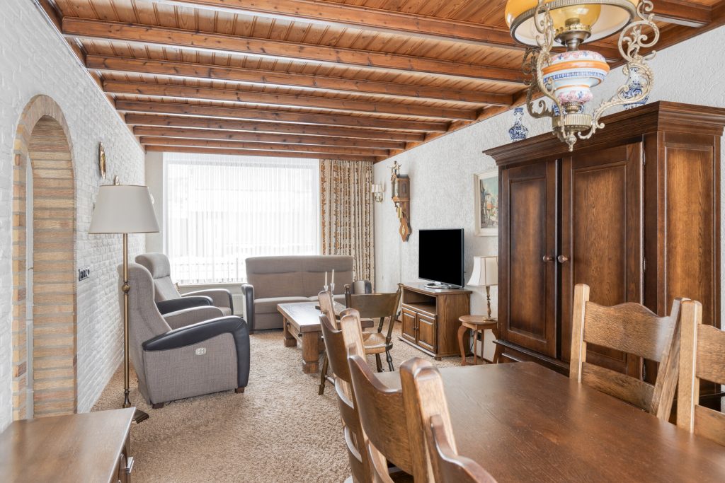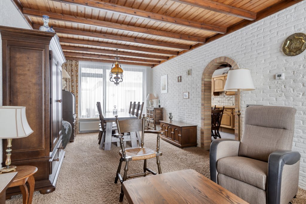 De doorzon woonkamer is belegd met vloerbedekking en afgewerkt met granol stucwerk wanden en een sierbalken plafond. De grote vensters aan de voor- en achterzijde bieden volop lichtinval.