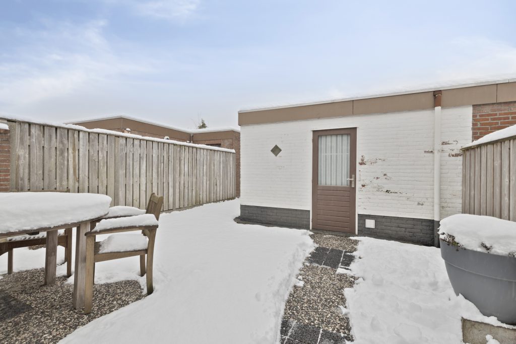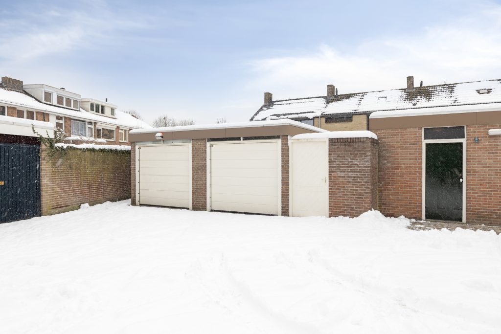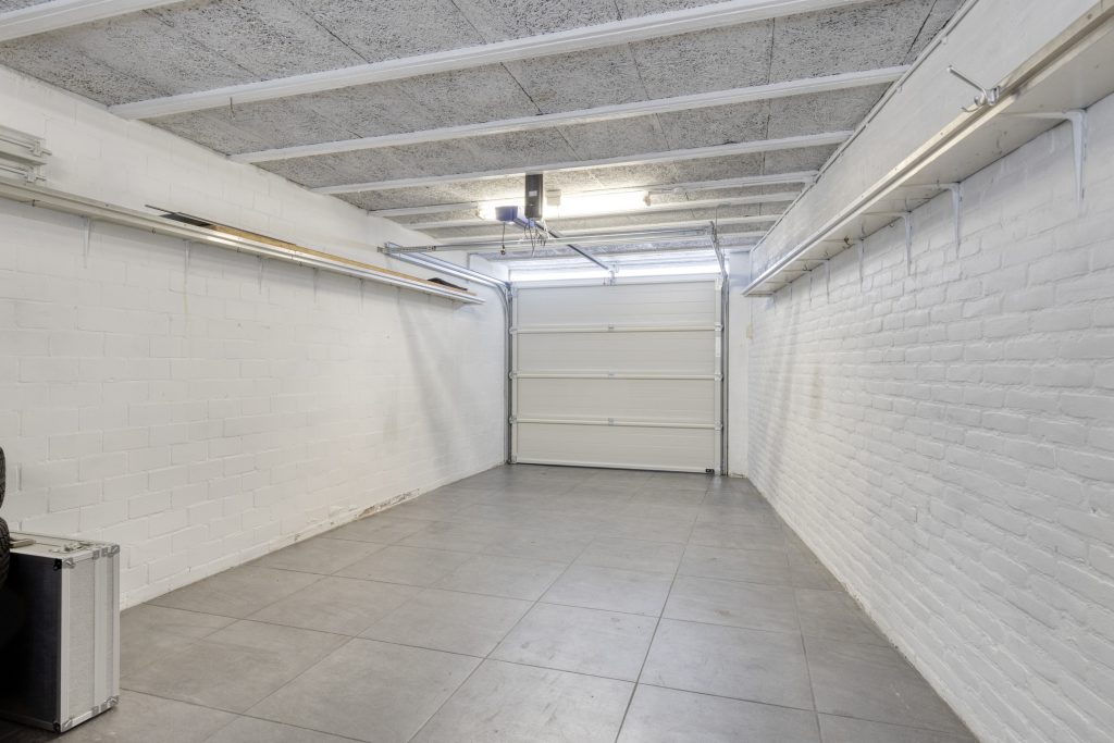 De omheinde achtertuin is volledig bestraat en heeft een achterom. In de tuin is de ruime garage van ca. 31 m² gelegen. Deze garage met tegelvloer, uitstortgootsteen, witgoedaansluitingen en elektra is een ideale stalling en of hobbyruimte. Een elektrische sectionaaldeur geeft toegang tot het achterterrein met toegang tot de openbare weg.
