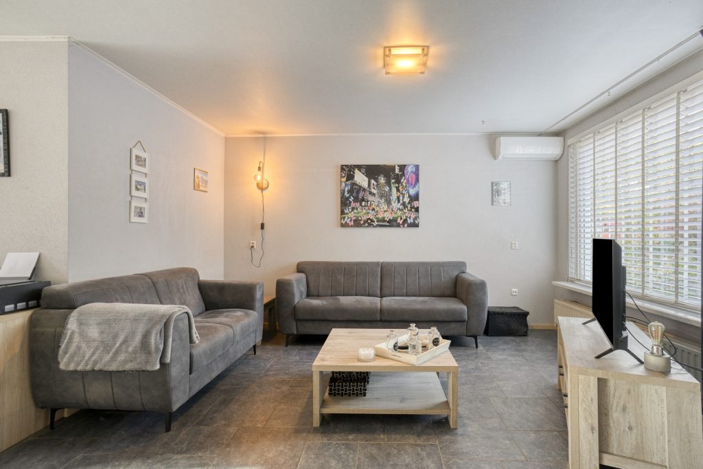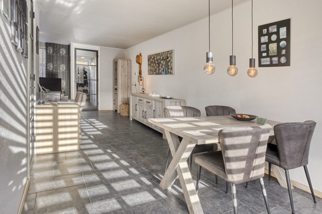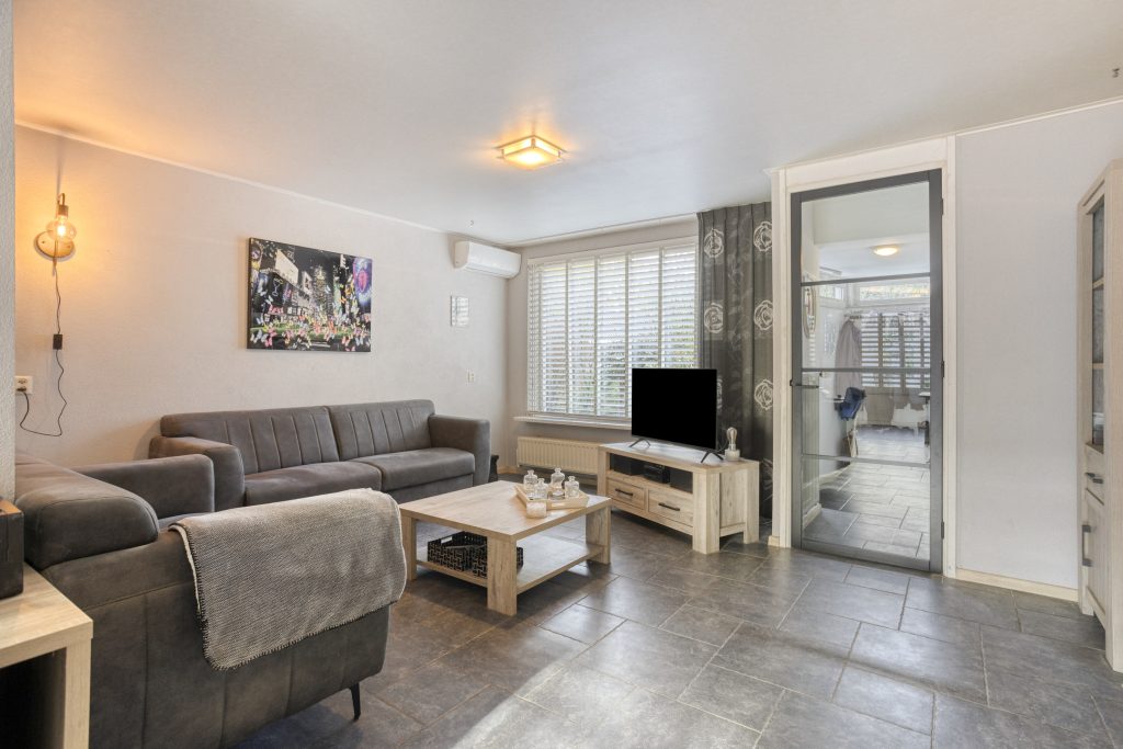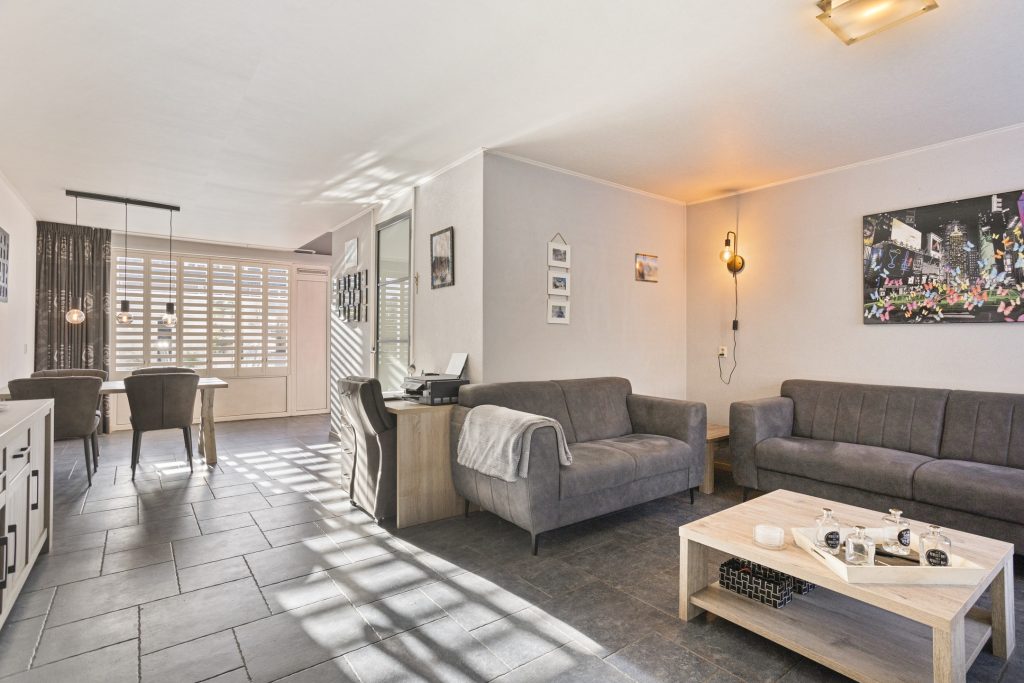 De woonkamer bevindt zich aan de voorzijde, maar loopt door naar de achterzijde van de woning. Hierdoor is de woonkamer gemakkelijk in te delen met een zitgedeelte en een eetgedeelte. In het midden van de woonkamer bevindt zich een gang naar de praktische provisieruimte en de trapopgang naar de eerste verdieping.