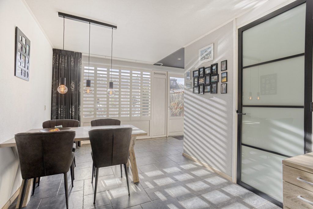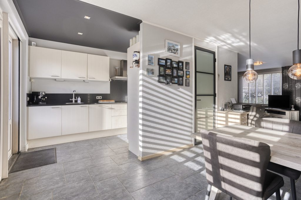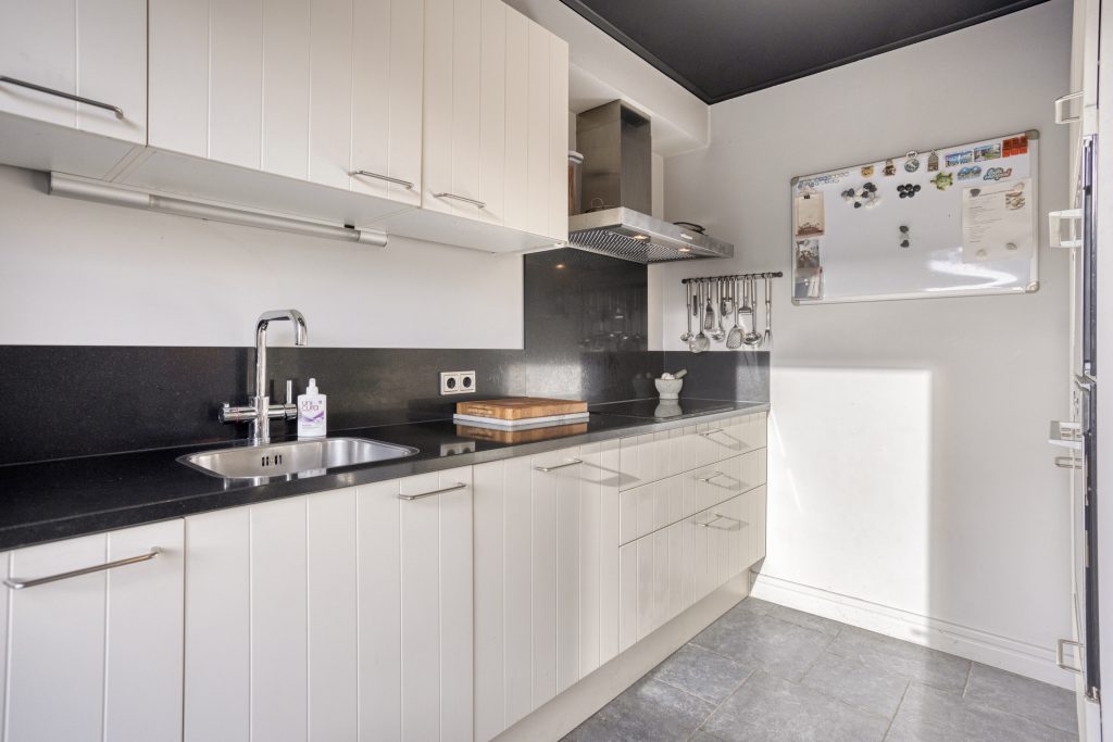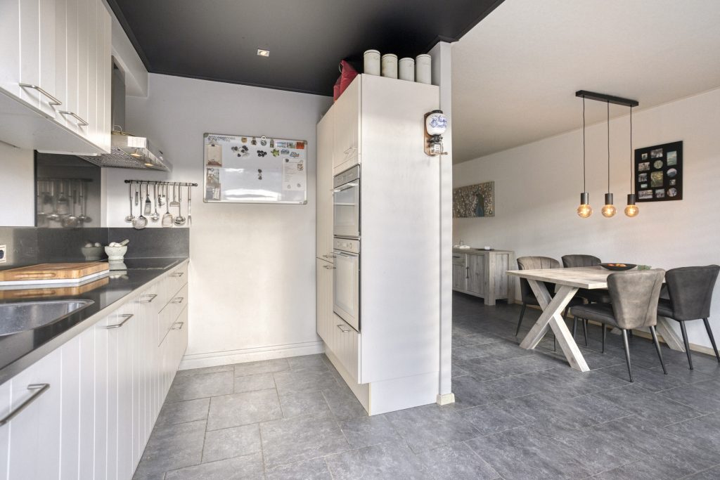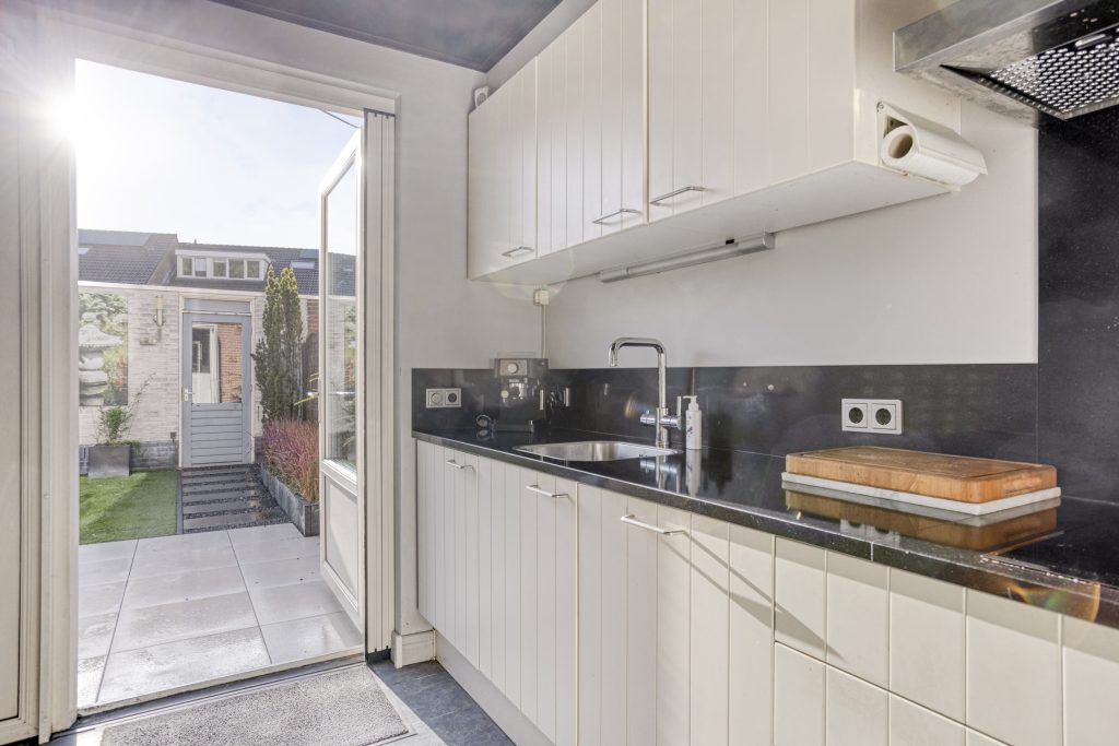 De open keuken bevindt zich aan de achterzijde van de woning en is geplaatst in een dubbele rechte wandopstelling en is voorzien van diverse inbouwapparatuur, onder andere een inductie kookplaat, een afzuigkap, twee ovens, een koelkast en een vaatwasser. Via een deur is de fraai aangelegde achtertuin te bereiken.