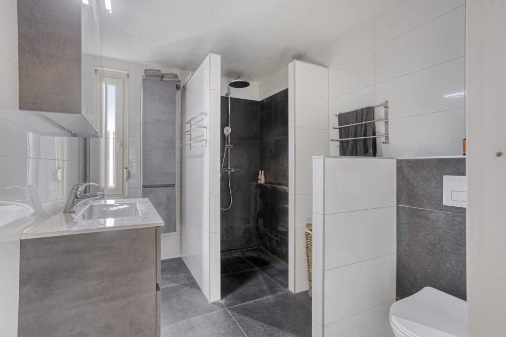 De badkamer is ingericht met een inloopdouche, een toilet en een wastafel in een fraai meubel. Tussen het raam en de inloopdouche bevindt zich een extra kast. Het raam zorgt voor de natuurlijke ventilatie naast de mechanische ventilatie.