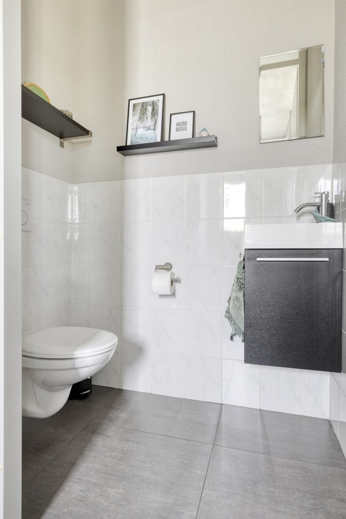 De gehele begane grond is voorzien van een moderne, licht grijze tegelvloer met vloerverwarming.