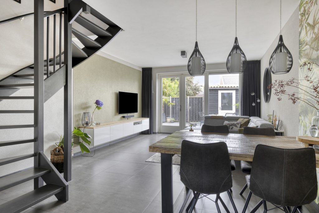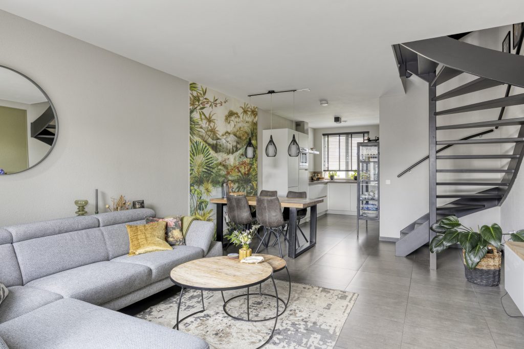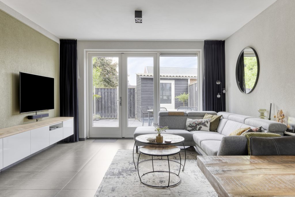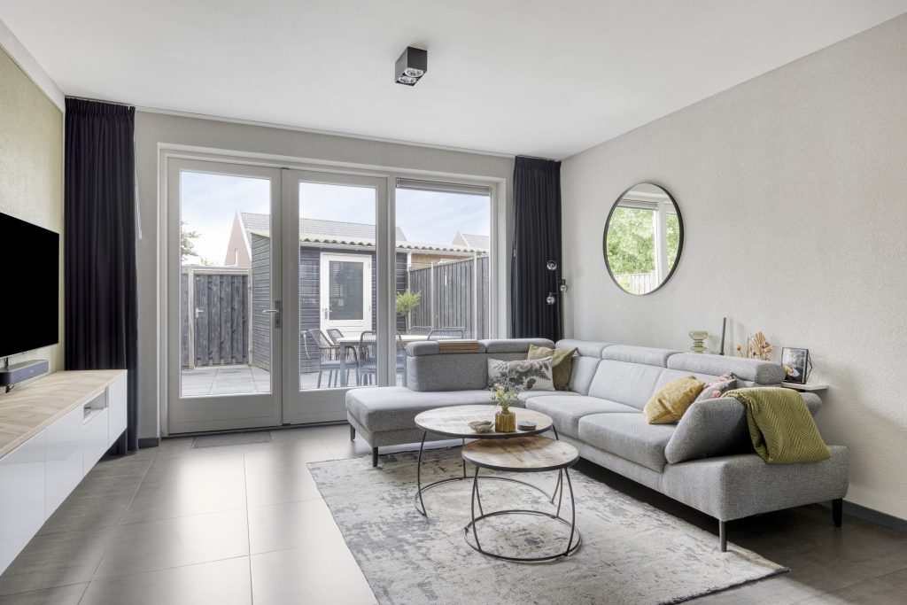 Aangrenzend bevindt zich de gezellige woonkamer die grotendeels is gestucadoord en in lichte en moderne tinten is afgewerkt. Aan de achterzijde geven openslaande tuindeuren toegang tot de tuin en komt er volop lichtinval de woonkamer binnen. In de woonkamer is de open trapopgang naar de 1e verdieping geplaatst.