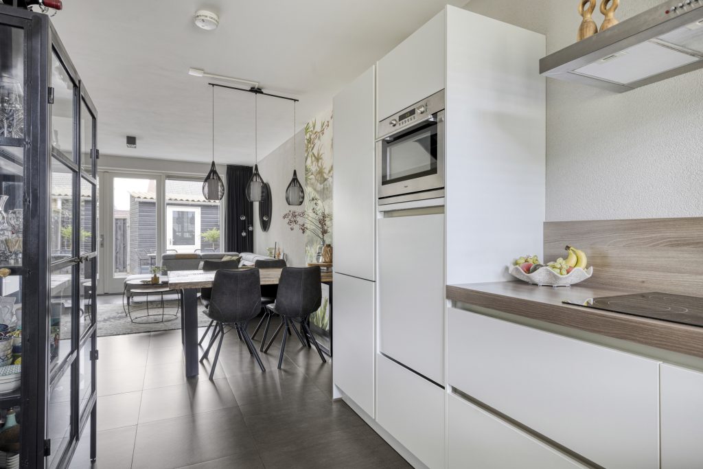 Via de voortuin is de woning bereikbaar. In de hal bevinden zich de meterkast, een bergkast en de deels betegelde toiletruimte met hangend toilet en fonteintje. Een deur met glaspartij geeft vervolgens toegang tot de keuken, met een moderne keukeninrichting in hoekopstelling. De keuken is compleet uitgerust met een inductiekookplaat, rvs afzuigkap, koelkast, vrieslades, spoelbak en een vaatwasser op werkhoogte. Het werkblad en de lades en kasten maken de keuken compleet.