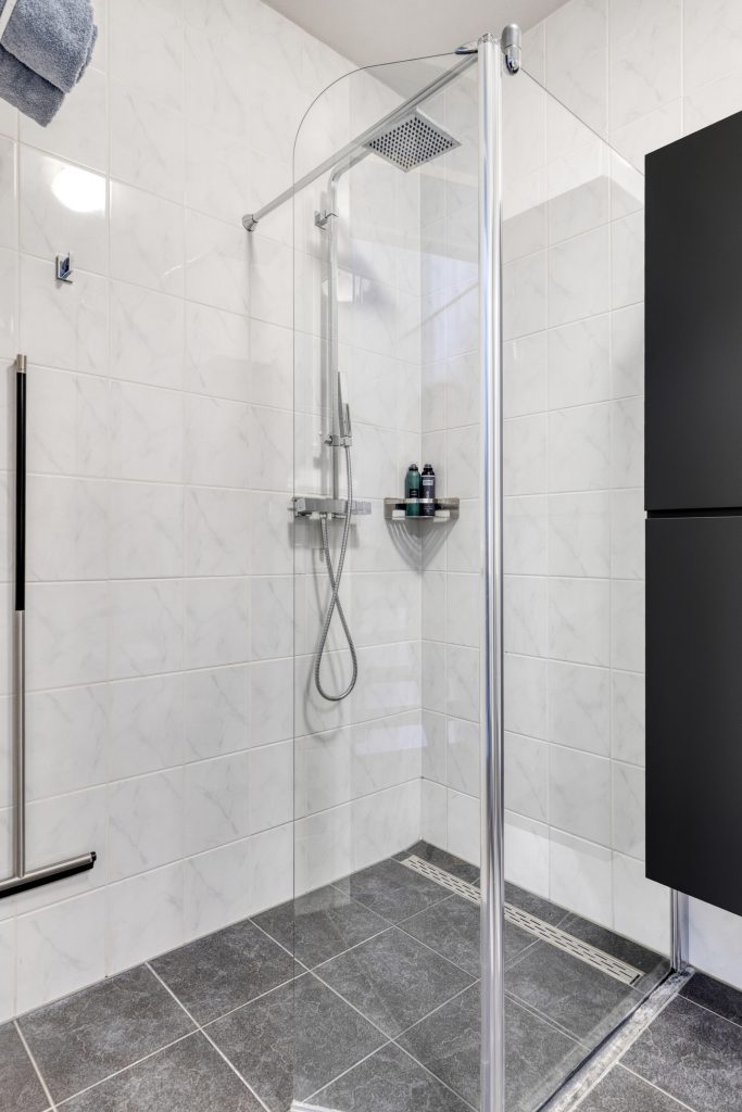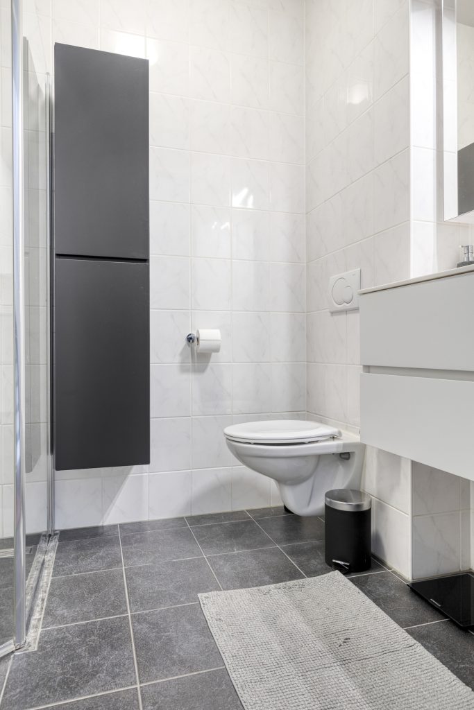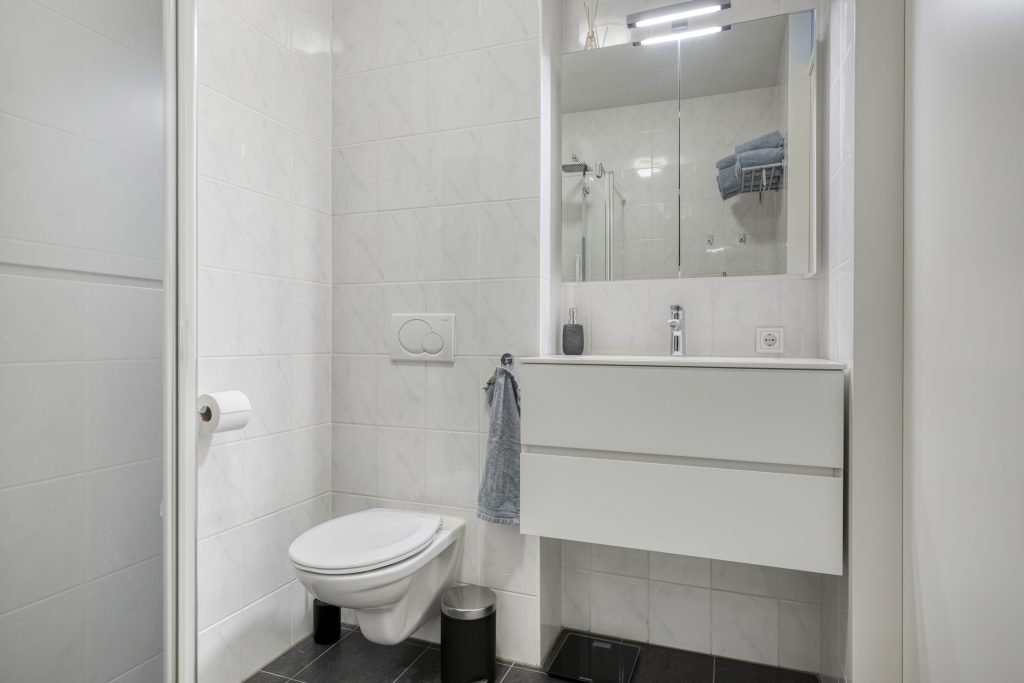 De badkamer is volledig betegeld en uitgerust met een inloopdouche, wastafelmeubel met spiegelkastje en een hangend toilet.