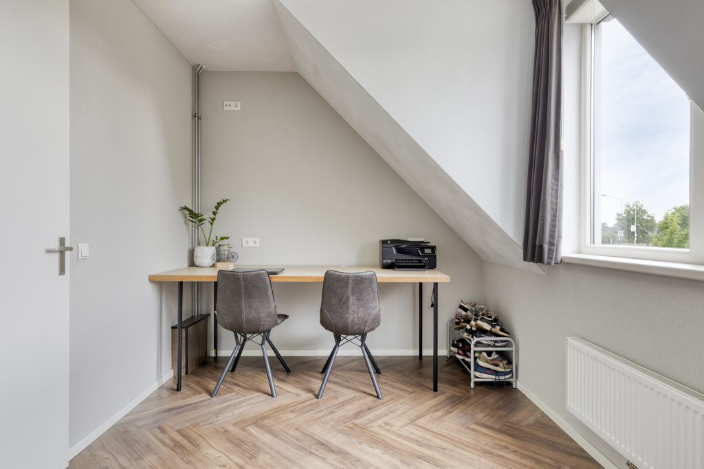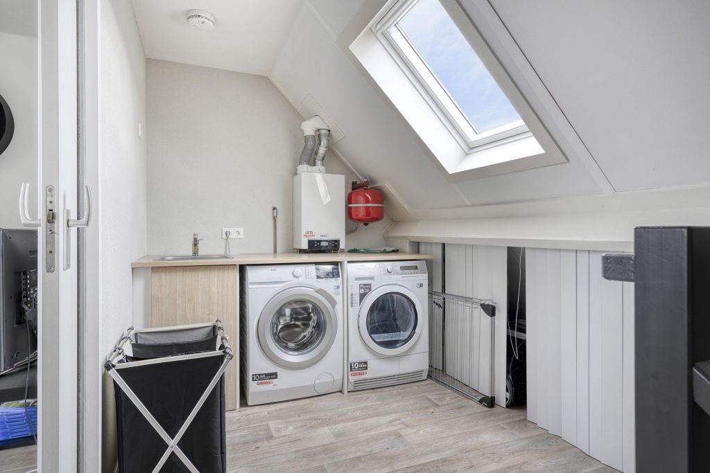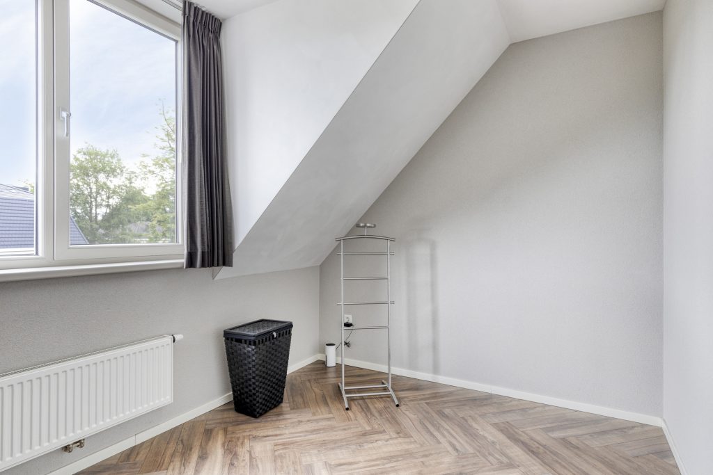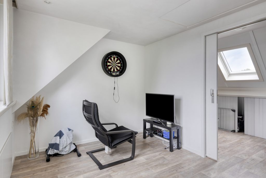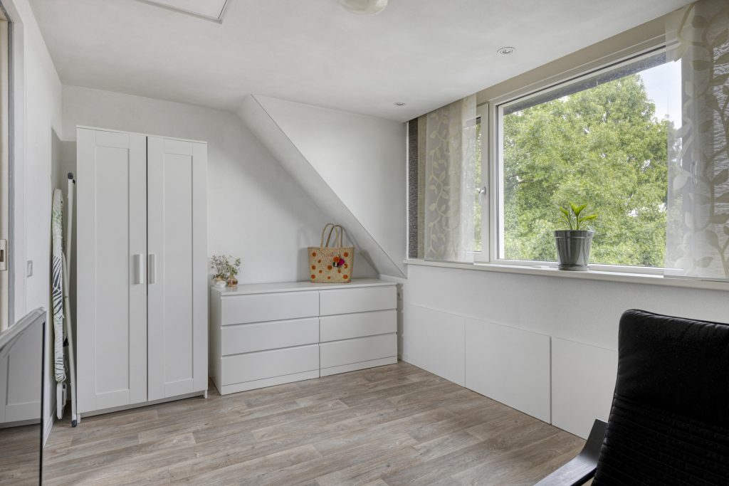 Een vaste trap geeft toegang tot een ruime voorzolder op de 2e verdieping, waar zich de witgoedaansluitingen en de cv-installatie bevinden. Een dakvenster geeft lichtinval. Middels een schuifpui is er toegang tot de 3e slaapkamer die gelegen is aan de achterzijde. Een groter dakkapel biedt volop ruimte en lichtinval. De kamer is gestucadoord en in het plafond is inbouwverlichting aanwezig. Middels een vlizotrap is een kleine bergzolder bereikbaar.