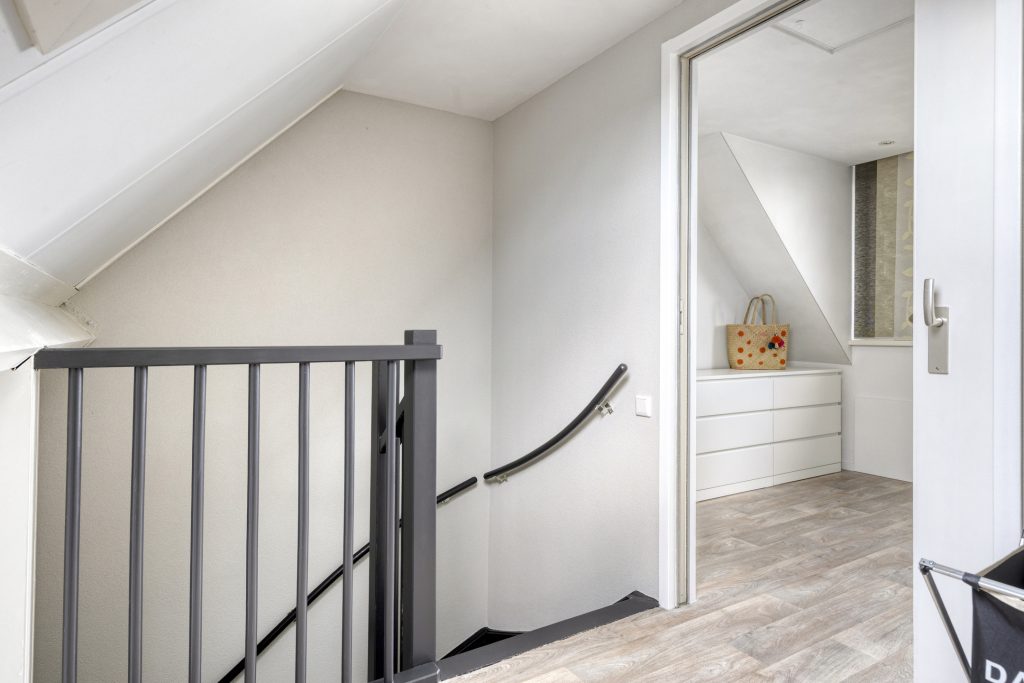 De overloop op de 1e verdieping geeft toegang tot 2 slaapkamers en de badkamer. De overloop en beide slaapkamers zijn voorzien van een laminaatvloer in visgraadmotief en de wanden en het plafond zijn volledig gestucadoord. De ruime hoofdslaapkamer is aan de achterzijde gelegen. De 2e kamer bevindt zich aan de voorzijde en heeft een dakkapel.